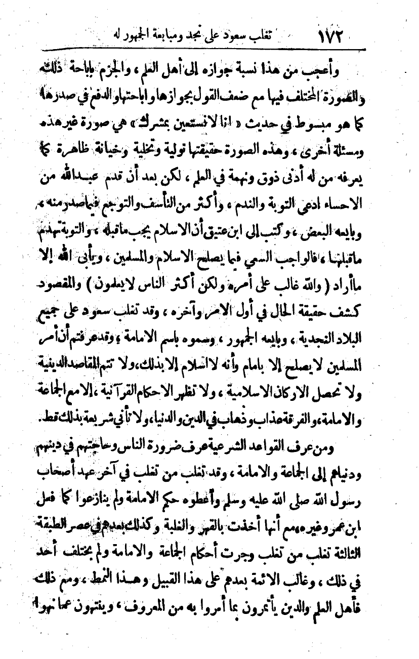 والمقصود: كشف حقيقة الحال في أول الأمر وآخره، وقد تغلب سعود على جميع البلاد النجدية، وبايعه الجمهور، وسموه باسم الإمامة، وقد عرفتم أن أمر المسلمين لا يصلح إلا بإمام، وأنه لا إسلام إلا بذلك، ولا تتم المقاصد الدينية ولا تحصل الأركان الإسلامية، ولا تظهر الأحكام القرآنية، إلا مع الجماعة والإمامة، والفرقة عذاب، وذهاب في الدين والدنيا، ولا تأتي شريعة بذلك قط.