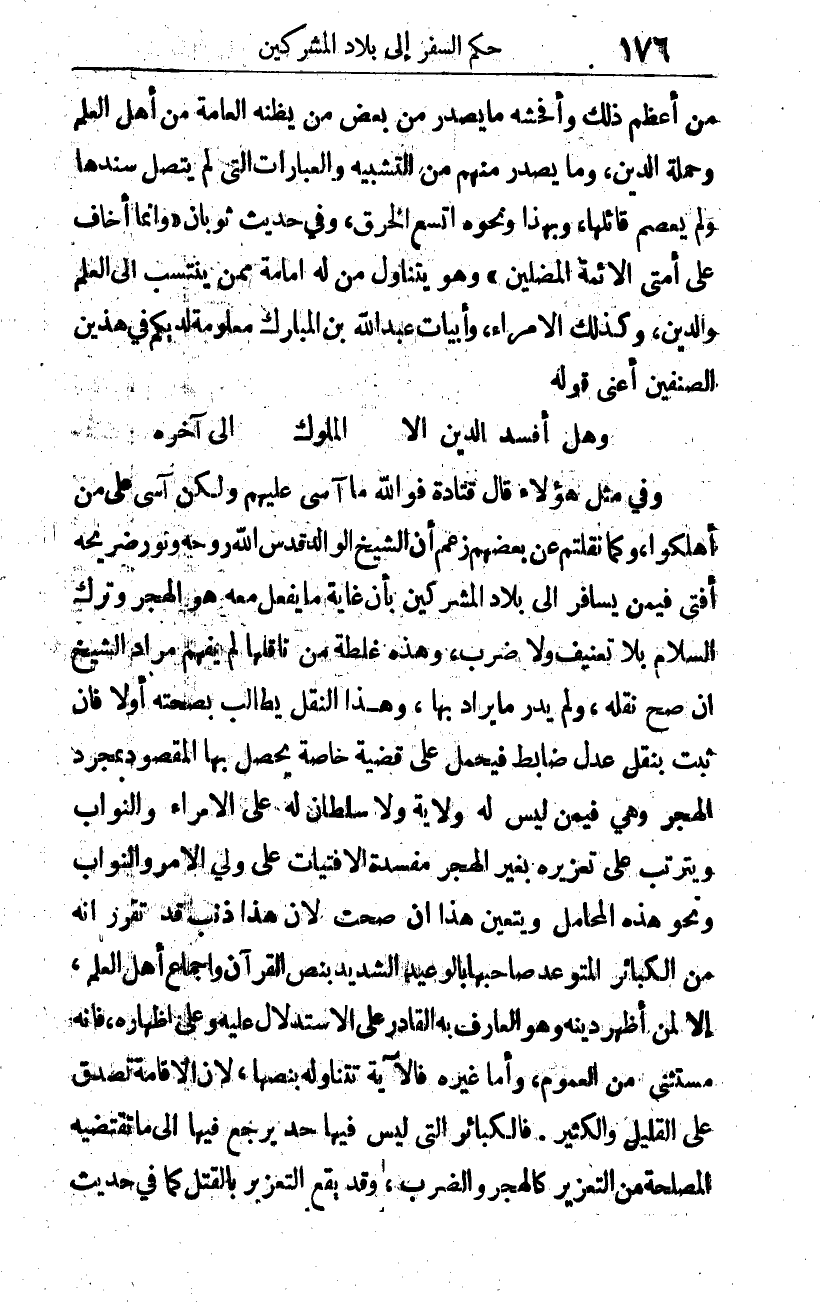 وفي مثل هؤلاء قال قتادة: فوالله ما آسى عليهم، ولكن آسى على مَن أهلكوا، وكما نقلتم عن بعضهم زعم أن الشيخ الوالد -قدس الله روحه، ونور ضريحه- أفتى فيمن يسافر إلى بلاد المشركين بأن غاية ما يفعل معه هو الهجر، وترك السلام بلا تعنيف ولا ضرب، وهذه غلطة من ناقلها لم يفهم مراد الشيخ -إن صح نقله- ولم يدر ما يراد بها. وهذا النقل يطالب بصحته أولا، فإن ثبت بنقل عدل ضابط فيحمل على قضية خاصة يحصل بها المقصود بمجرد الهجر، وهي فيمن ليس له ولاية ولا سلطان له على الأمراء والنواب، ويترتب على تعزيره بغير الهجر مفسدة الافتيات على ولي الأمر والنواب، ونحو هذه المحامل. ويتعين هذا -إن صحت-، لأن هذا ذنب قد تقرر أنه من الكبائر المُتَوَعَّدُ صاحبها بالوعيد الشديد بنص القرآن وإجماع أهل العلم، إلا لمن أظهر دينه، وهو العارف به، القادر على الاستدلال وعلى إظهاره، فإنه مُستثنًى من العموم، وأما غيره فالآية تتناوله بنصها لأن الإقامة تصدق على القليل والكثير. فالكبائر التي ليس فيها حَدٌّ يُرجع فيها إلى ما تقتضيه المصلحة من التعزير كالهجر والضرب، وقد يقع التعزير بالقتل كما في حديث
