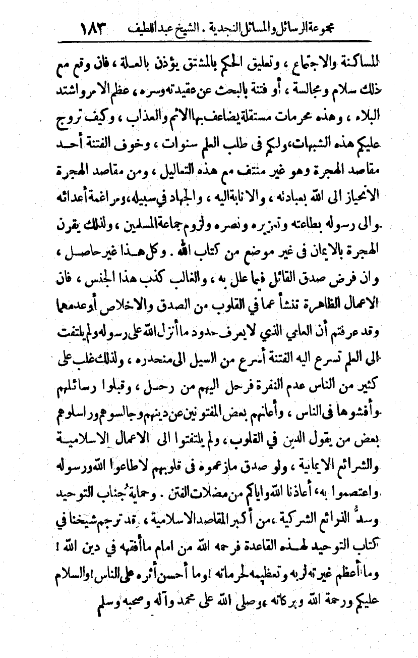 المساكنة والاجتماع، وتعليق الحكم بالمشتق يؤذن بالعلة، فإن وقع مع ذلك سلام ومجالسة، أو فتنة بالبحث عن عقيدته وسره، عظم الأمر واشتد البلاء، وهذه محرمات مستقلة يضاعف بها الإثم والعذاب. وكيف تروج عليكم هذه الشبهات، ولكم في طلب العلم سنوات، وخوف الفتنة أحد مقاصد الهجرة، وهو غير منتفٍ مع هذه التعاليل. ومن مقاصد الهجرة الانحياز إلى الله بعبادته، والإنابة إليه، والجهاد في سبيله، ومراغمة أعدائه وإلى رسوله بطاعته وتعزيره ونصره ولزوم جماعة المسلمين، ولذلك يقرن الهجرة بالإيمان في غير موضع من كتاب الله. وكل هذا غير حاصل، وإن فرض صدق القائل فيما علل به، والغالب كذب هذا الجنس، فإن الأعمال الظاهرة تنشأ عما في القلوب من الصدق والإخلاص أو عدمهما. وقد عرفتم أن العامي الذي لا يعرف حدود ما أنزل الله على رسوله، ولم يلتفت إلى العلم تسرع إليه الفتنة أسرع من السيل إلى مُنْحَدره، ولذلك غلب على كثير من الناس عدم النُّفْرَة فرحل إليهم مَن رحل، وقبلوا رسائلهم وأفشوها في الناس، وأعانهم بعض المفتونين عن دينهم وجالسهم وراسلهم بعضُ من يقول: الدين في القلوب، ولم يلتفتوا إلى الأعمال الإسلامية والشرائع الإيمانية، ولو صدق ما زعموه في قلوبهم لأطاعوا الله ورسوله واعتصموا به، أعاذنا الله وإياكم من مُضَلات الفتن. وحماية جَنَاب التوحيد وسدُّ الذرائع الشركية، من أكبر المقاصد الإسلامية، وقد ترجم شيخنا في كتاب التوحيد لهذه القاعدة، فرحمه الله من إمام، ما أفقهه في دين الله! وما أعظم غيرته لربه وتعظيمه لحرماته! وما أحسن أثره على الناس! والسلام عليكم ورحمة الله وبركاته، وصلى الله على محمد وآله وصحبه وسلم.