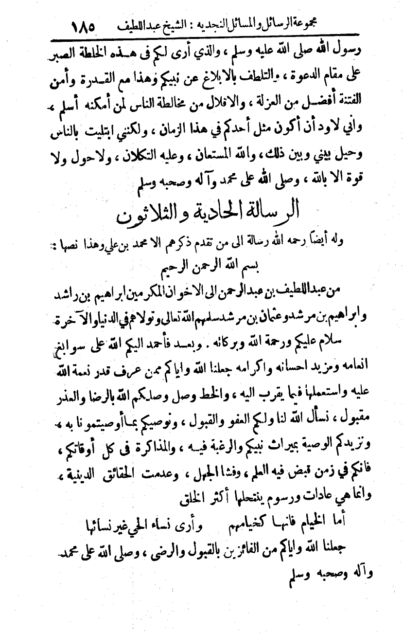 سلام عليكم ورحمة الله وبركاته. وبعدُ: فأحمد إليكم الله على سوابغ إنعامه ومزيد إحسانه وإكرامه، جعلنا الله وإياكم ممن عرف قدر نعمة الله عليه، واستعملها فيما يقرب إليه، والخط وصل -وصلكم الله بالرضى- والعذر مقبول. نسأل الله لنا ولكم العفو والقبول، ونوصيكم بما أوصيتمونا به، ونزيدكم الوصية بميراث نبيكم والرغبة فيه، والمُذاكرة في كل أوقاتكم، فإنكم في زمن قُبِضَ فيه العلم، وفَشَا الجهل، وعُدِمَتْ الحقائقُ الدينية، وإنما هي عادات ورسوم ينتحلها أكثرُ الخلق.
