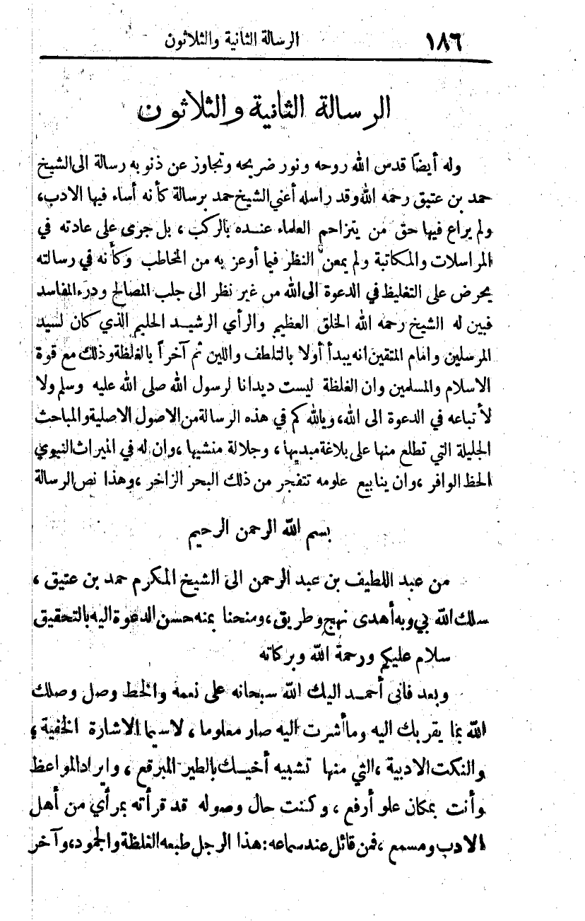 من عبد اللطيف بن عبد الرحمن إلى الشيخ المكرم حمد بن عتيق، سلك الله بي وبه أهدى نهج وطريق، ومنحنا بِمَنِّهِ حُسْنَ الدعوة إليه بالتحقيق.