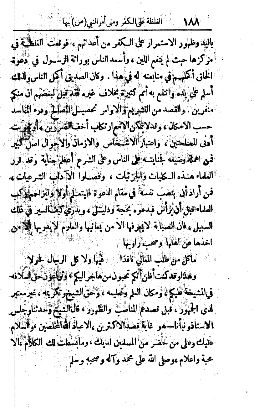 وهذا، وقد كنت أظن أنكم تحبون مَن هاجر إليكم، وتراعون حق أسلافه في المشيخة عليكم، ومكان العلم وتعليمه، وحق الشيخ وتكريمه غير معتبر لدى الجمهور، قبل قصدهم المناصب والظهور، قال الشيخ، وحدثنا، وجلس الأستاذ، ونبأنا - هو غاية قصد الأكثرين، إلا عباد الله المخلصين. والسلام عليك وعلى من حضر من المسلمين لديك، وما بسطت لك الكلام، إلا محبة وإعلام، وصلى الله على محمد وآله وصحبه وسلم.