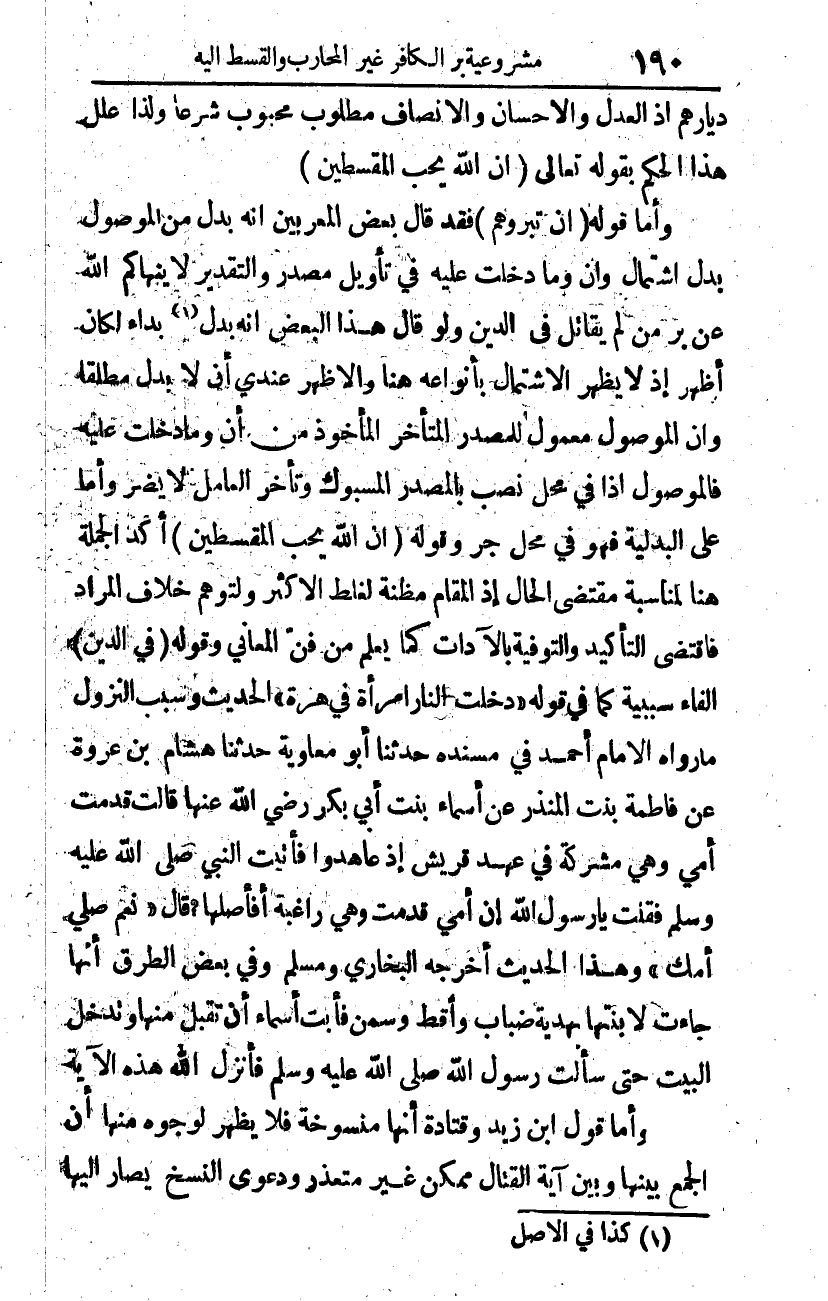 وأما قوله {أَنْ تَبَرُّوهُمْ} 2 فقد قال بعض المُعْرِبِينَ: إنه بدل من الموصول بدل اشتمال، و"أن" وما دخلت عليه: في تأويل مصدر، والتقدير: لا ينهاكم الله عن بِرِّ مَن لم يقاتل في الدين، ولو قال هذا البعض: إنه بدل 3 بُدَاءً: لكان أظهر؛ إذ لا يظهر الاشتمال بأنواعه هنا؛ والأظهر عندي أنْ لا بدلَ مطلقا؛ وأن الموصول معمولٌ للمصدر المتأخر المأخوذ من "أن" وما دخلت عليه؛ فالموصول إذًا في محل نصب بالمصدر المسبوك؛ وتَأَخُّرُ العاملِ لا يضر، وأما على البدلية فهو في محل جر. وقوله: {إِنَّ اللَّهَ يُحِبُّ الْمُقْسِطِينَ} 4، أكد الجملة هنا لمناسبة مقتضى الحال؛ إذ المقام مظنة لغلط الأكثر؛ ولتوهم خلاف المراد فاقتضى التأكيد والتوفية بالأداة؛ كما يعلم من فن المعاني؛ وقوله: {فِي الدِّينِ} الفاء سببية كما في قوله: "دخلت النار امرأة في هرة"5 الحديث. وسبب النّزول ما رواه الإمام أحمد في مسنده حدثنا أبو معاوية حدثنا هشام بن عروة عن فاطمة بنت المنذر عن أسماء بنت أبي بكر -رضي الله عنها- قالت: قدمت أمي وهي مشركة في عهد قريش إذ عاهدوا، فأتيتُ النبي صلى الله عليه وسلم فقلت يا رسول الله: "إن أمي قدمتْ وهي راغبة، أفأصلها؟ قال: نعم صلي أمك"6، وهذا الحديث أخرجه البخاري ومسلم. وفي بعض الطرق: أنها جاءت لابنتها بهدية ضباب وأقط وسمن، فأبت أسماء أن تقبل منها وتدخل البيت حتى سألت رسول الله صلى الله عليه وسلم فأنزل الله هذه الآية.