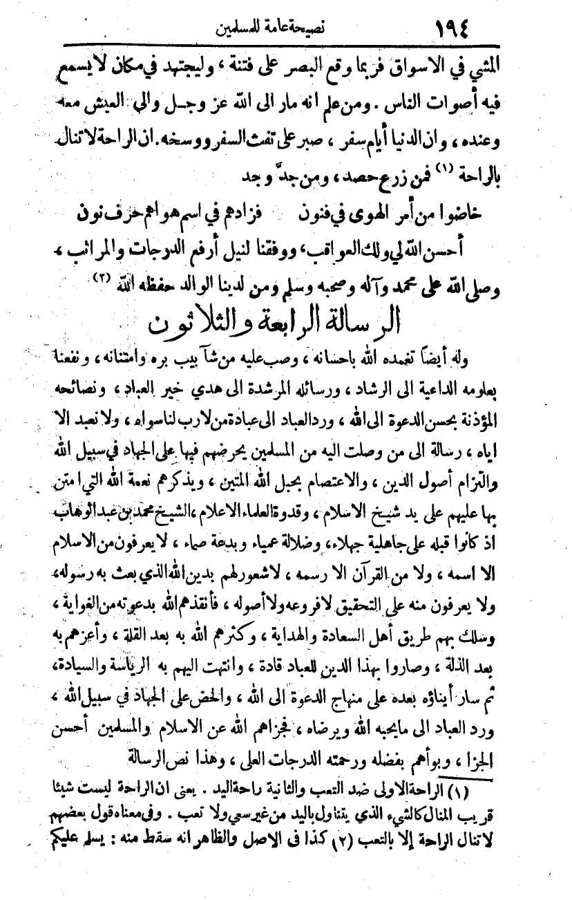 وله أيضا، تغمده الله بإحسانه، وصب عليه من شآبيب بره وامتنانه، ونفعنا بعلومه الداعية إلى الرشاد، ورسائله المرشدة إلى هدي خير العباد، ونصائحه المؤذنة بحسن الدعوة إلى الله، ورد العباد إلى عبادة من لا رب لنا سواه، ولا نعبد إلا إياه، رسالة إلى من وصلت إليه من المسلمين يحرِّضهم فيها على الجهاد في سبيل الله والتزام أصول الدين، والاعتصام بحبل الله المتين. ويذَكِّرهم نعمة الله التي امتنَّ بها عليهم على يد شيخ الإسلام، وقدوة العلماء الأعلام، الشيخ محمد بن عبد الوهاب؛ إذ كانوا قبله على جاهلية جهلاء، وضلالة عمياء وبدعة صماء، لا يعرفون من الإسلام إلا اسمه، ولا من القرآن إلا رسمه، لا شعور لهم بدين الله الذي بعث به رسوله، ولا يعرفون منه على التحقيق لا فروعه ولا أصوله، فأنقذهم الله بدعوته من الغواية، وسلك بهم طريق أهل السعادة والهداية، وكثَّرَهم الله به بعد القلة، وأعزهم به بعد الذلة. وصاروا بهذا الدين للعباد قادة، وانتهت إليهم به الرياسة والسيادة، ثم سار أبناؤه بعده على منهاج الدعوة إلى الله، والحضّ على الجهاد في سبيل الله، ورد العباد إلى ما يحبه الله ويرضاه، فجزاهم الله عن الإسلام والمسلمين أحسن الجزاء، وبَوَّأَهُمْ بفضله ورحمته الدرجات العلى، وهذا نص الرسالة: