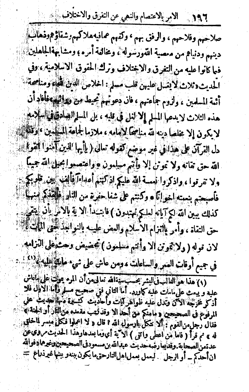 صلاحهم وفلاحهم، والرفق بهم، وكفُّهُم عما فيه هلاكهم وشقاؤهم وذهاب دينهم ودنياهم من معصية الله ورسوله، ومخالفة أمره، ومشابهة الجاهلين فيما كانوا عليه من التفرق والاختلاف وترك الحقوق الإسلامية. وفي الحديث: "ثلاث لا يُغَلُّ عليهن قلب مسلم: إخلاص الدين لله، ومناصحة أئمة المسلمين، ولزوم جماعتهم، فإن دعوتهم تحيط من ورائهم"، فأفاد أن هذه الثلاث لا يدعها المسلم إلا لِغِلٍّ في قلبه، بل المسلم الصادق في إسلامه لا يكون إلا: مُخْلِصًا دينَه لله، مُنَاصِحًا لإمامه، مُلازِمًا لجماعة المسلمين. وقد دل القرآن على هذا في غير موضع، كقوله تعالى: {يَا أَيُّهَا الَّذِينَ آمَنُوا اتَّقُوا اللَّهَ حَقَّ تُقَاتِهِ وَلا تَمُوتُنَّ إِلَّا وَأَنْتُمْ مُسْلِمُونَ وَاعْتَصِمُوا بِحَبْلِ اللَّهِ جَمِيعًا وَلا تَفَرَّقُوا وَاذْكُرُوا نِعْمَتَ اللَّهِ عَلَيْكُمْ إِذْ كُنْتُمْ أَعْدَاءً فَأَلَّفَ بَيْنَ قُلُوبِكُمْ فَأَصْبَحْتُمْ بِنِعْمَتِهِ إِخْوَانًا وَكُنْتُمْ عَلَى شَفَا حُفْرَةٍ مِنَ النَّارِ فَأَنْقَذَكُمْ مِنْهَا كَذَلِكَ يُبَيِّنُ اللَّهُ لَكُمْ آيَاتِهِ لَعَلَّكُمْ تَهْتَدُونَ} 1. فابتدأ الآية بالأمر بأن يُتَّقَى حَقَّ التُّقَاة، وأمر بالتزام الإسلام، والعض عليه بالنواجذ حتى الممات، لأن قوله: {وَلا تَمُوتُنَّ إِلَّا وَأَنْتُمْ مُسْلِمُونَ} 2 تحضيضٌ وحَثُّ على التزامه في جميع أوقات العمر والساعات، ومن عاش على شيء مات عليه 3