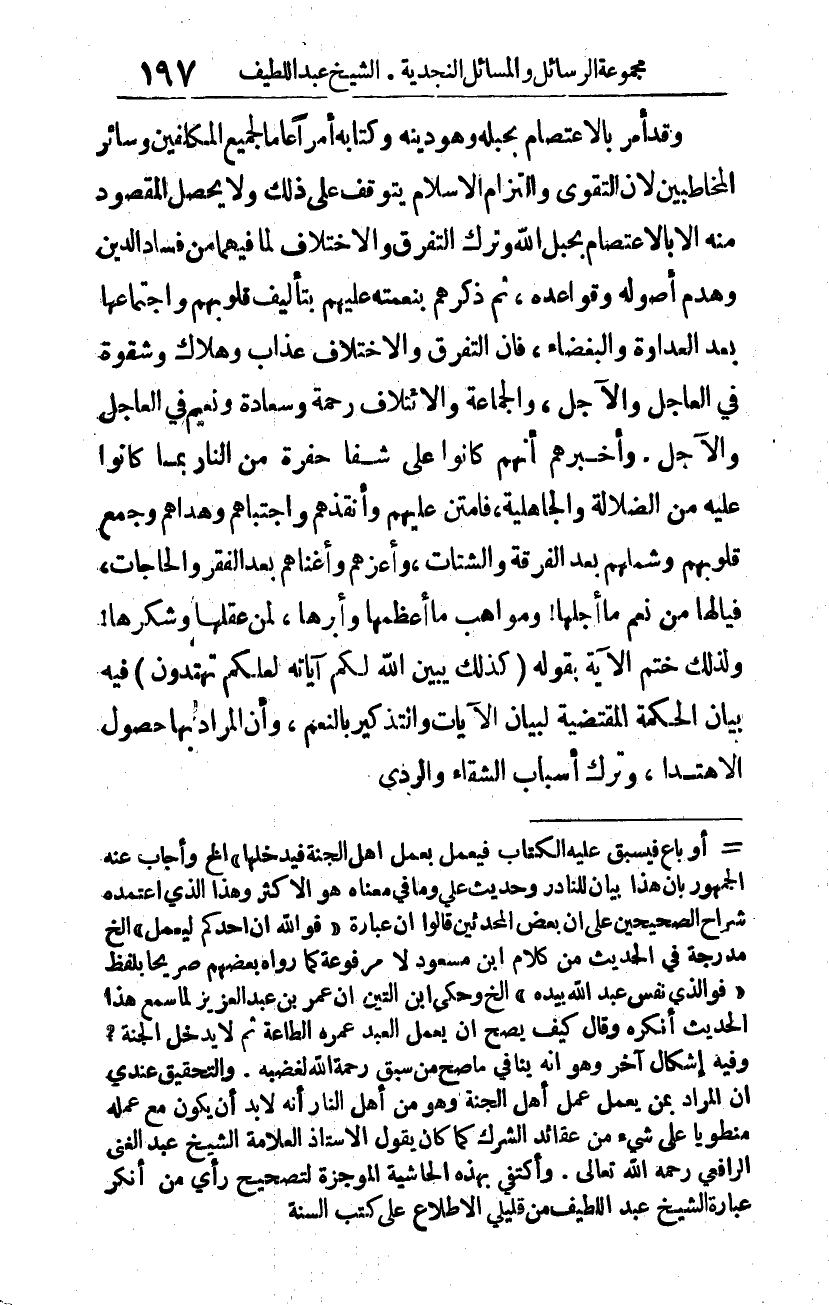 = أو باع فيسبق عليه الكتاب فيعمل بعمل أهل الجنة فيدخلها" إلخ. وأجاب عنه الجمهور: بأن هذا بيان للنادر وحديث علي وما في معناه هو الأكثر، وهذا الذي اعتمده شراح الصحيحين على أن بعض المحدثين قالوا: إن عبارة "فوالله إن أحدكم ليعمل" إلخ مُدْرَجَة في الحديث من كلام ابن مسعود، لا مرفوعة كما رواه بعضهم صريحا، بلفظ "فوالذي نفس عبد الله بيده" إلخ. وحكى ابن التين أن عمر بن عبد العزيز لما سمع هذا الحديث أنكره، وقال: كيف يصح أن يعمل العبد عمره الطاعة لا يدخل الجنة؟ وفيه إشكال آخر، وهو: أنه ينافي ما صح من سبق رحمة الله لغضبه. والتحقيق -عندي- أن المراد بمن يعمل عمل أهل الجنة وهو من أهل النار: أنه لا بد أن يكون مع عمله منطويا على شيء من عقائد الشرك؛ كما كان يقول الأستاذ العلامة الشيخ عبد الغني الرافعي -رحمه الله تعالى-. وأكتفي بهذه الحاشية الموجزة لتصحيح رأي من أنكر عبارة الشيخ عبد اللطيف من قليلي الاطلاع على كتب السنة.