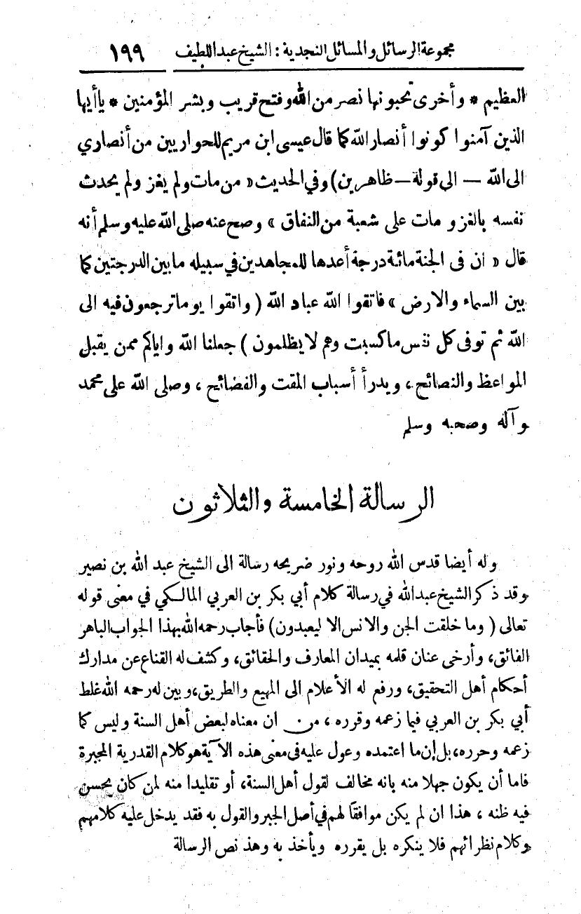 وله أيضا -قدس الله روحه، ونور ضريحه- رسالة إلى الشيخ عبد الله بن نصير، وقد ذكر الشيخ عبد الله في رسالة كلام أبي بكر بن العربي المالكي في معنى قوله تعالى: {وَمَا خَلَقْتُ الْجِنَّ وَالأِنْسَ إِلَّا لِيَعْبُدُونِ} 5. فأجاب -رحمه الله- بهذا الجواب الباهر الفائق، وأرخى عنان قلمه بميدان المعارف والحقائق، وكشف له القناع عن مدارك أحكام أهل التحقيق، ورفع له الأعلام إلى المَهْيَع والطريق، وبَيَّنَ له -رحمه الله- غلطَ أبي بكر بن العربي فيما زعمه وقرره، من أن معناه لبعض أهل السنة، وليس كما زعمه وحرره. بل إن ما اعتمده وعول عليه في معنى هذه الآية هو: كلام القدرية المجبرة، فإما أن يكون جهلا منه بأنه مخالف لقول أهل السنة، أو تقليدا منه لمن كان يحسن فيه ظنه، هذا إن لم يكن موافقا لهم في أصل الجبر والقول به، فقد يدخل عليه كلامهم وكلام نظرائهم، فلا ينكره، بل يقرره، ويأخذ به، وهذا نص الرسالة: