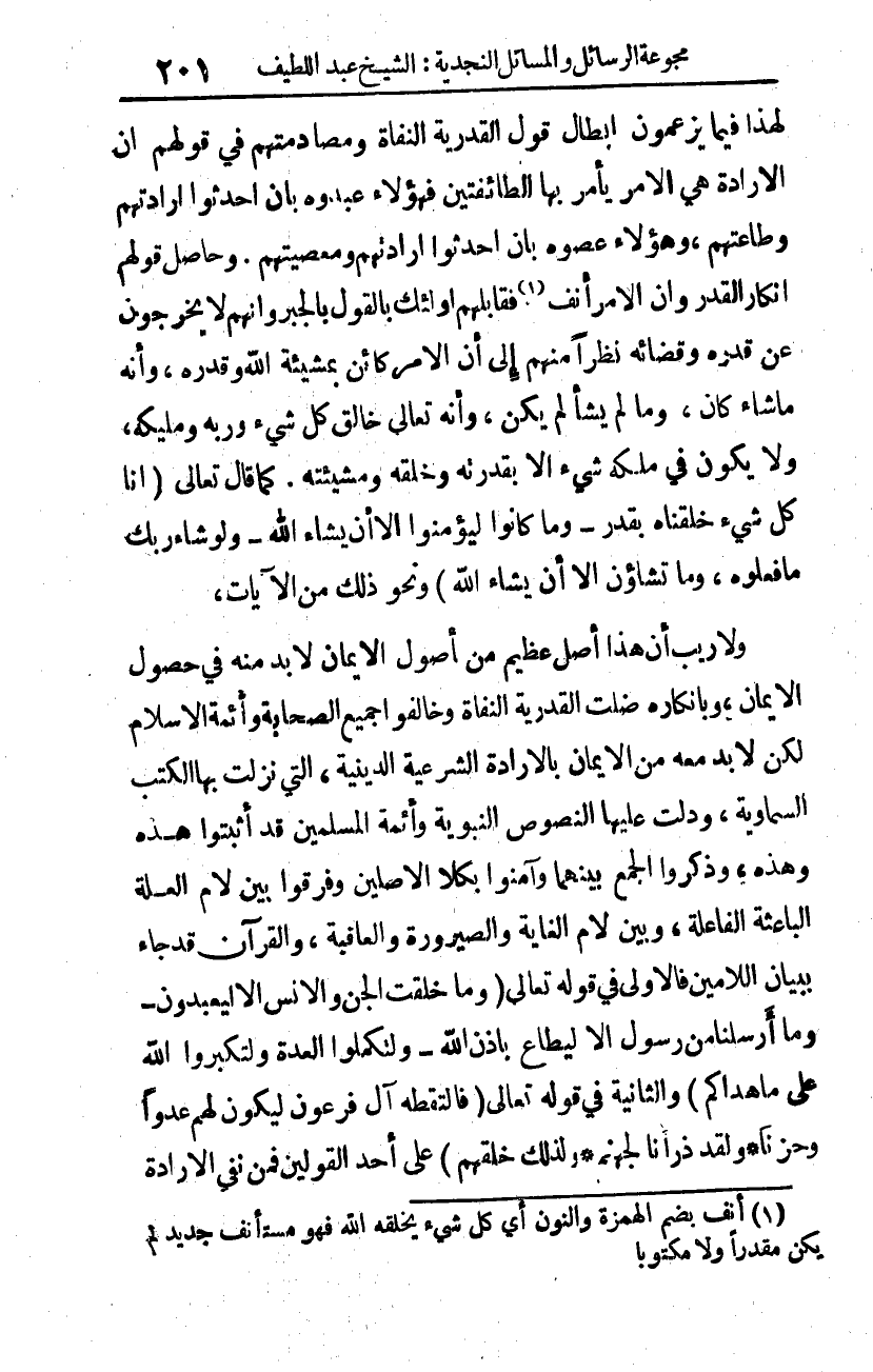 ولا ريب أن هذا أصل عظيم من أصول الإيمان، لا بد منه في حصول الإيمان، وبإنكاره ضلت القدرية النفاة وخالفوا جميع الصحابة وأئمة الإسلام، لكن لا بد معه من الإيمان بالإرادة الشرعية الدينية، التي نزلت بها الكتب السماوية، ودلّت عليها النصوص النبوية.