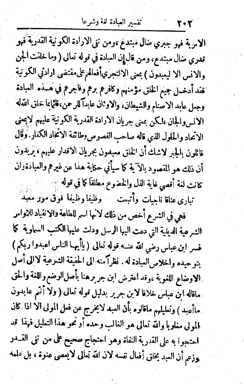 فهي في الشرع أخص من ذلك، لأنها اسم للطاعة والانقياد للأوامر الشرعية الدينية التي دعت إليها الرسل، ودلت عليها الكتب السماوية، كما فسر ابن عباس رضي الله عنه قوله تعالى: {يَا أَيُّهَا النَّاسُ اعْبُدُوا} 2 بتوحيده وإخلاص العبادة له، نظرًا منه إلى الحقيقة الشرعية لا إلى أصل الأوضاع اللغوية. وقد اعترض ابن جرير هنا بأصل الوضع واللغة، والحق ما قاله ابن عباس خلافا لابن جرير، بدليل قوله تعالى: {لا أَنْتُمْ عَابِدُونَ مَا أَعْبُدُ} 3، وتعليلهم ما قالوه، بأن العبد لا يخرج عن فعل المولى إلا إذا كان المولى مغلوبا، والله -تعالى- هو الغالب وحده، أو نحو هذا التعليل. فهذا قد احتجوا به على القدرية النفاة، وهو احتجاج صحيح على من نفى القدر، وزعم أن العبد يخلق أفعال نفسه لأن الله -تعالى- لا يعصى عنوة، بل علمه
