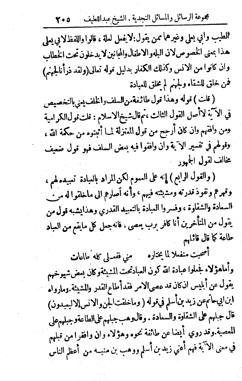 وأما هؤلاء فجعلوا عبادة الله كون العباد تحت المشيئة، وكان بعض شيوخهم يقول عن إبليس: إن كان قد عصى الأمر فقد أطاع القدر والمشيئة. وما رواه ابن أبي حاتم عن زيد بن أسلم في قوله: {وَمَا خَلَقْتُ الْجِنَّ وَالأِنْسَ إِلَّا لِيَعْبُدُونِ} 2 قال: جبلهم على الشقاوة والسعادة. وقال وهب: جبلهم على الطاعة، وجبلهم على المعصية. وقد روي أيضا عن طائفة نحوه، وهؤلاء، وإن وافقوا من قبلهم في معنى الآية فهم -أعني زيد بن أسلم ووهب بن منبه- من أعظم الناس