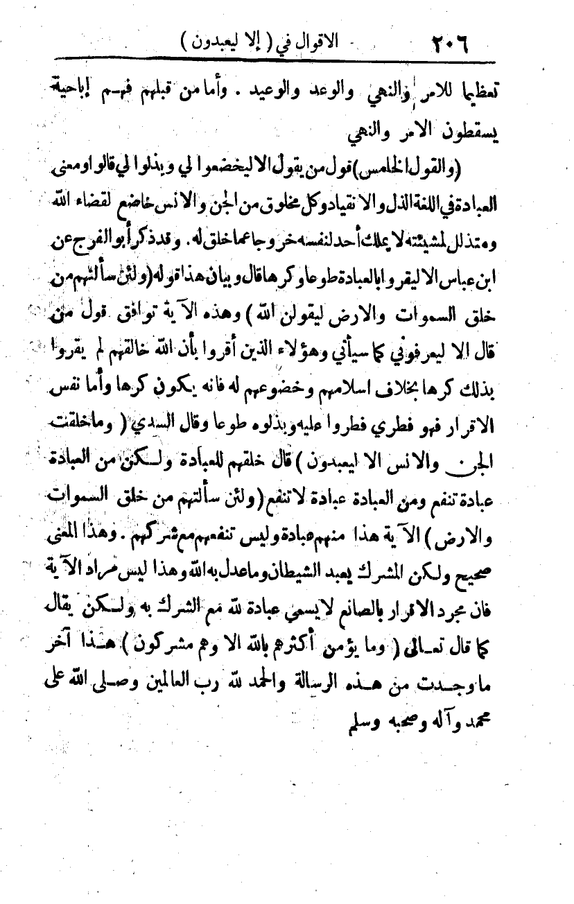 (والقول الخامس): قول من يقول: إلا ليخضعوا لي، ويذلوا لي، قالوا: ومعنى العبادة في اللغة: الذل والانقياد. وكل مخلوق من الجن والإنس خاضع لقضاء الله، ومتذلل لمشيئته، لا يملك أحد لنفسه خروجا عما خلق له. وقد ذكر أبو الفرج عن ابن عباس: إلا ليقروا بالعبادة طوعا وكرها، قال: وبيان هذا قوله: {وَلَئِنْ سَأَلْتَهُمْ مَنْ خَلَقَ السَّمَاوَاتِ وَالأَرْضَ لَيَقُولُنَّ اللَّهُ} 1، وهذه الآية توافق قول من قال: إلا ليعرفوني -كما سيأتي- وهؤلاء الذين أقروا بأن الله خالقهم، لم يقروا بذلك كرها، بخلاف إسلامهم وخضوعهم له، فإنه يكون كرها، وأما نفس الإقرار فهو فطري فطروا عليه وبذلوه طوعا. وقال السدي: {وَمَا خَلَقْتُ الْجِنَّ وَالأِنْسَ إِلَّا لِيَعْبُدُونِ} 2 قال: خلقهم للعبادة، ولكن من العبادة عبادة تنفع، ومن العبادة عبادة لا تنفع: {وَلَئِنْ سَأَلْتَهُمْ مَنْ خَلَقَ السَّمَاوَاتِ وَالأَرْضَ} 3 الآية هذا منهم عبادة، وليس تنفعهم مع شركهم. وهذا المعنى صحيح؛ ولكن المشرك يعبد الشيطان، وما عدل به الله، وهذا ليس مراد الآية، فإن مجرد الإقرار بالصانع لا يسمى عبادة لله مع الشرك به، ولكن يقال كما قال -تعالى-: {وَمَا يُؤْمِنُ أَكْثَرُهُمْ بِاللَّهِ إِلا وَهُمْ مُشْرِكُونَ} 4. هذا آخر ما وجدت من هذه الرسالة، والحمد لله رب العالمين. وصلى الله على محمد وآله وصحبه وسلم.
