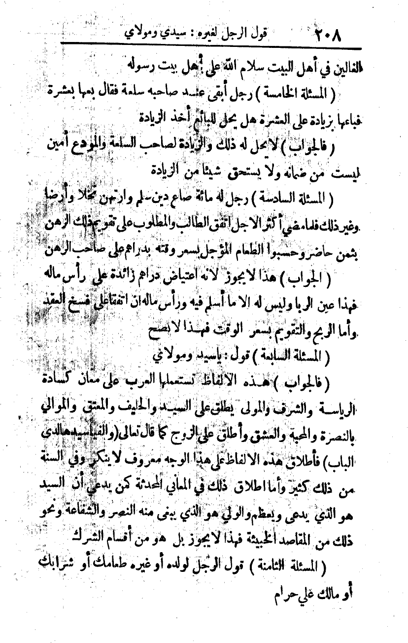 (فالجواب): هذه الألفاظ تستعملها العرب على معان، كسادة الرياسة والشرف، والمولى يطلق على السيد والحليف والمعتق والموالي بالنصرة، والمحبة والعشق، وأطلق على الزوج، كما قال -تعالى-: {وَأَلْفَيَا سَيِّدَهَا لَدَى الْبَابِ} 1، فإطلاق هذه الألفاظ على هذا الوجه معروف لا ينكر، وفي السنة من ذلك كثير. وأما إطلاق ذلك في المعاني المحدثة، كمن يدعي أن السيد هو الذي يدعى ويعظم، والولي هو الذي يبغى منه النصر والشفاعة، ونحو ذلك من المقاصد الخبيثة، فهذا لا يجوز، بل هو من أقسام الشرك.