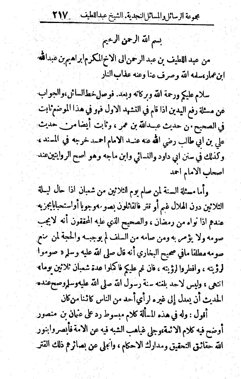 من عبد اللطيف بن عبد الرحمن، إلى الأخ المكرم: إبراهيم بن عبد الله بن عمار -سلمه الله، وصرف عنا وعنه عذاب النار-.