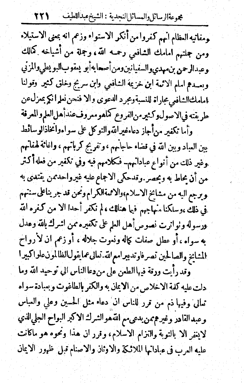 وأما تكفير من أجاز دعاء غير الله، والتوكل على سواه، واتخاذ الوسائط بين العباد وبين الله في قضاء حاجاتهم، وتفريج كرباتهم، وإغاثة لهفاتهم، وغير ذلك من أنواع عباداتهم، فكلامهم فيه، وفي تكفير من فعله أكثر من أن يحاط به ويحصر. وقد حكى الإجماع عليه غير واحد ممن يقتدى به ويُرجَع إليه من مشايخ الإسلام، والأئمة الكرام، ونحن قد جرينا على سنتهم في ذلك، وسلكنا منهاجهم فيما هنالك، لم نكفر أحدا إلا من كفره الله ورسوله، وتواترت نصوص أهل العلم على تكفيره، ممن أشرك بالله، وعدل به سواه، أو عطل صفات كماله، ونعوت جلاله، أو زعم أن لأرواح المشايخ والصالحين تصرفا وتدبيرا مع الله؛ تعالى عما يقول الظالمون علوا كبيرا.