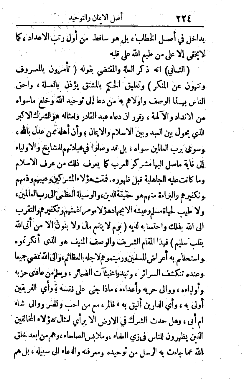 (الثاني): أنه ذكر العلة والمقتضي بقوله: {تَأْمُرُونَ بِالْمَعْرُوفِ وَتَنْهَوْنَ عَنِ الْمُنْكَرِ} 1 وتعليق الحكم بالمشتق يؤذن بالعلة؛ وأحق الناس بهذا الوصف وأولاهم به من دعا إلى توحيد الله، وخلع ما سواه، من الأنداد والآلهة، وقرر أن دعاء عبد القادر وأمثاله هو الشرك الأكبر، الذي يحول بين العبد وبين الإسلام والإيمان، وأن أهله ممن عدل بالله، وسوّى برب العالمين سواه، بل قد وصلوا في عبادتهم للمشايخ والأولياء إلى غاية ما وصل إليها مشركو العرب، كما يعرف ذلك من عرف الإسلام، وما كانت عليه الجاهلية قبل ظهوره. فمقت هؤلاء المشركين وعيبهم وذمهم وتكفيرهم والبراءة منهم هو حقيقة الدين، والوسيلة العظمى إلى رب العالمين؛ ولا طيب لحياة مسلم وعيشه إلا بجهاد هؤلاء ومراغمتهم وتكفيرهم، والتقرب إلى الله بذلك واحتسابه لديه: {يَوْمَ لا يَنْفَعُ مَالٌ وَلا بَنُونَ إِلَّا مَنْ أَتَى اللَّهَ بِقَلْبٍ سَلِيمٍ} 2. فهذا المقام الشريف، والوصف المنيف، هو الذي أنكرتموه، واستحللتم به أعراض المسلمين، ورميتموهم لأجله بالعظائم، وإلى الله نمضي جميعا وعنده تنكشف السرائر، وتبدو مخبآت الضمائر، ويعلم من عادى حزبه وأولياءه، ووالى حربه وأعداءه، ماذا جنى على نفسه، وأي الفريقين أولى به، وأي الدارين أليق به، فالمرء مع من أحب ونصر ووالى شاء أم أبى. وهل حدث الشرك في الأرض إلا برأي أمثال هؤلاء المخالفين الذين يظهرون للناس في زي العلماء، وملابس الصلحاء؟ وهم من أبعد خلق الله عما جاءت به الرسل من توحيده ومعرفته، والدعاء إلى سبيله؛ بل هم