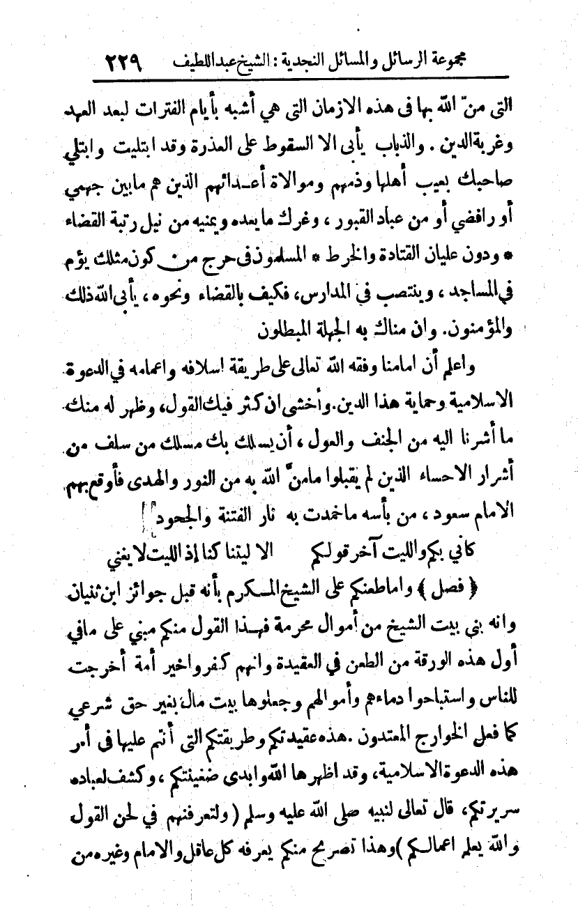 (فصل) وأما طعنكم على الشيخ المكرم بأنه قبل جوائز ابن ثنيان، وأنه بنى بيت الشيخ من أموال محرمة، فهذا القول منكم مبني على ما في أول هذه الورقة من الطعن في العقيدة، وأنهم كفّروا خير أمة أخرجت للناس، واستباحوا دماءهم وأموالهم، وجعلوها بيت مال بغير حق شرعي، كما فعل الخوارج المعتدون. هذه عقيدتكم وطريقتكم التي أنتم عليها في أمر هذه الدعوة الإسلامية، وقد أظهرها الله، وأبدى ضغينتكم، وكشف لعباده سريرتكم، قال -تعالى- لنبيه صلى الله عليه وسلم {فِي لَحْنِ الْقَوْلِ وَاللَّهُ يَعْلَمُ أَعْمَالَكُمْ} 1. وهذا تصريح منكم يعرفه كل عاقل، والإمام وغيره من