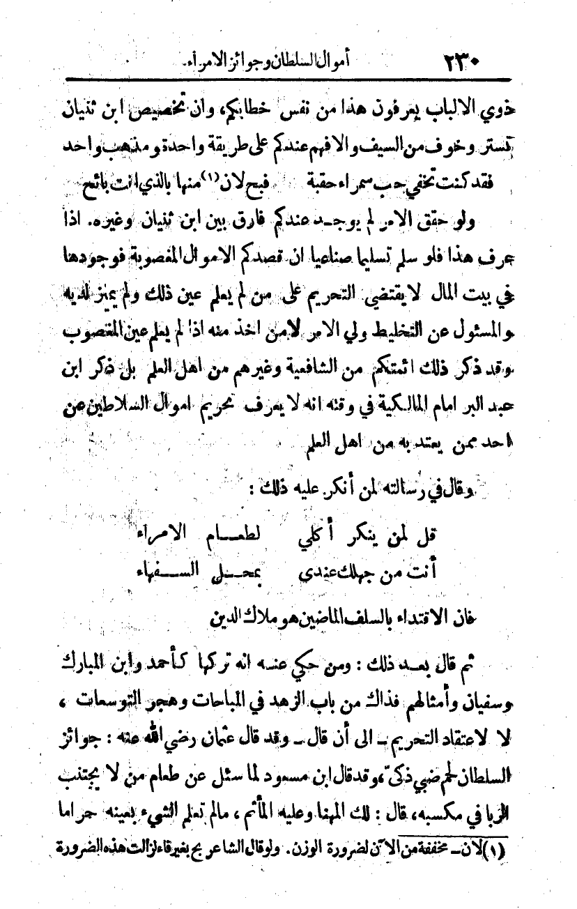 ولو حقق الأمر، لم يوجد عندكم فارق بين ابن ثنيان وغيره. إذا عرف هذا، فلو سلم تسليما صناعيا أن قصدكم الأموال المغصوبة، فوجودها في بيت المال لا يقتضي التحريم على من لم يعلم عين ذلك، ولم يميز لديه، والمسؤول عن التخليط ولي الأمر، لا من أخذ منه، إذا لم يعلم عين المغصوب، وقد ذكر ذلك أئمتكم من الشافعية، وغيرهم من أهل العلم، بل ذكر ابن عبد البر إمام المالكية في وقته أنه لا يعرف تحريم أموال السلاطين عن أحد ممن يعتد به من أهل العلم.