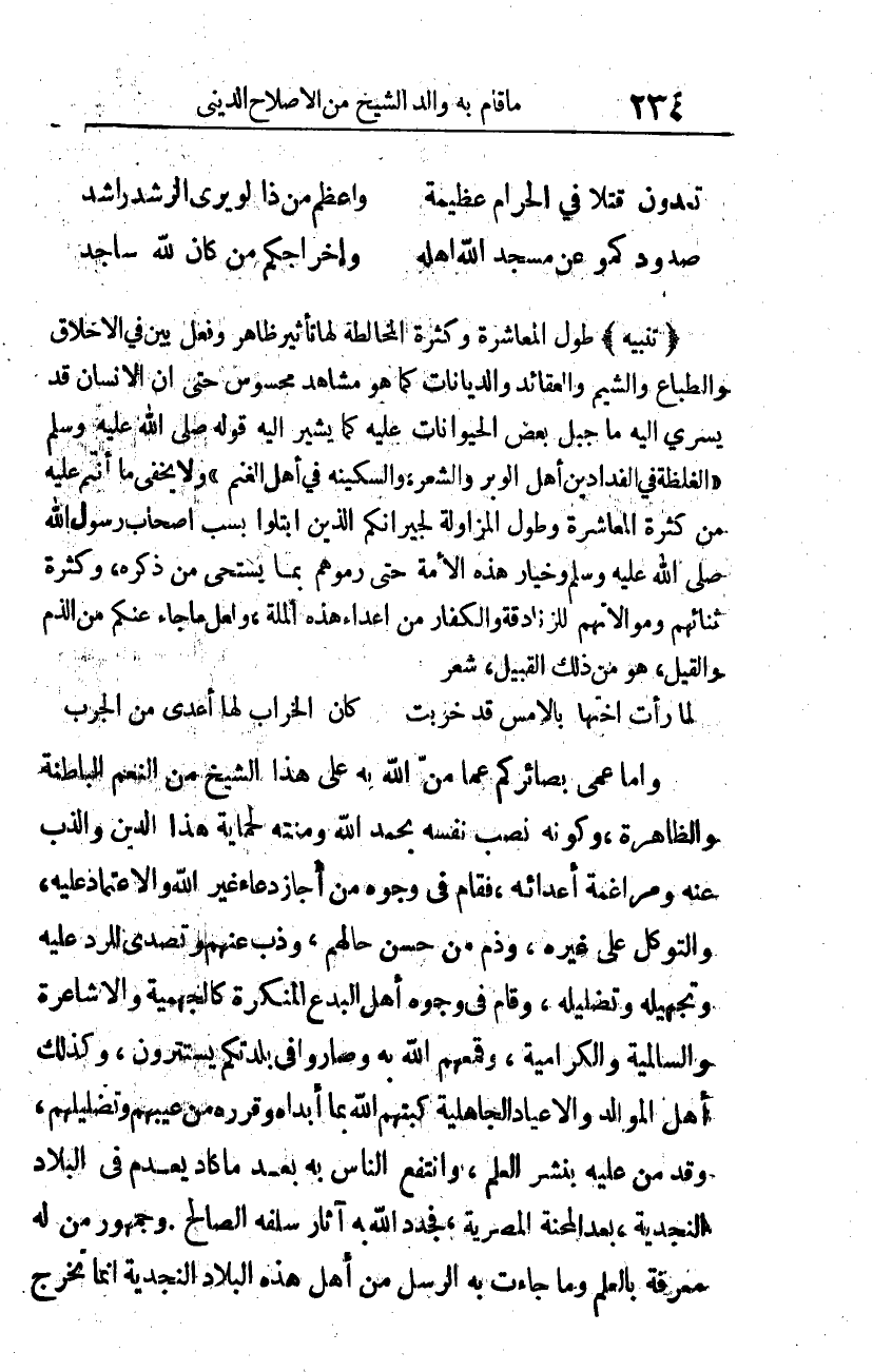 (تنبيه) طول المعاشرة، وكثرة المخالطة لها تأثير ظاهر، وفعل بيّن في الأخلاق والطباع والشيم والعقائد والديانات، كما هو مشاهد محسوس، حتى إن الإنسان قد يسري إليه ما جبل بعض الحيوانات عليه، كما يشير إليه قوله صلى الله عليه وسلم: "الغلظة في الفدّادين أهل الوبر والشعر، والسكينه في أهل الغنم". ولا يخفى ما أنتم عليه من كثرة المعاشرة، وطول المزاولة لجيرانكم، الذين ابتلوا بسب أصحاب رسول الله صلى الله عليه وسلم وخيار هذه الأمة، حتى رموهم بما يستحى من ذكره، وكثرة ثنائهم وموالاتهم للزنادقة والكفار من أعداء هذه الملة، ولعل ما جاء عنكم من الذم والقيل، هو من ذلك القبيل. شعر: