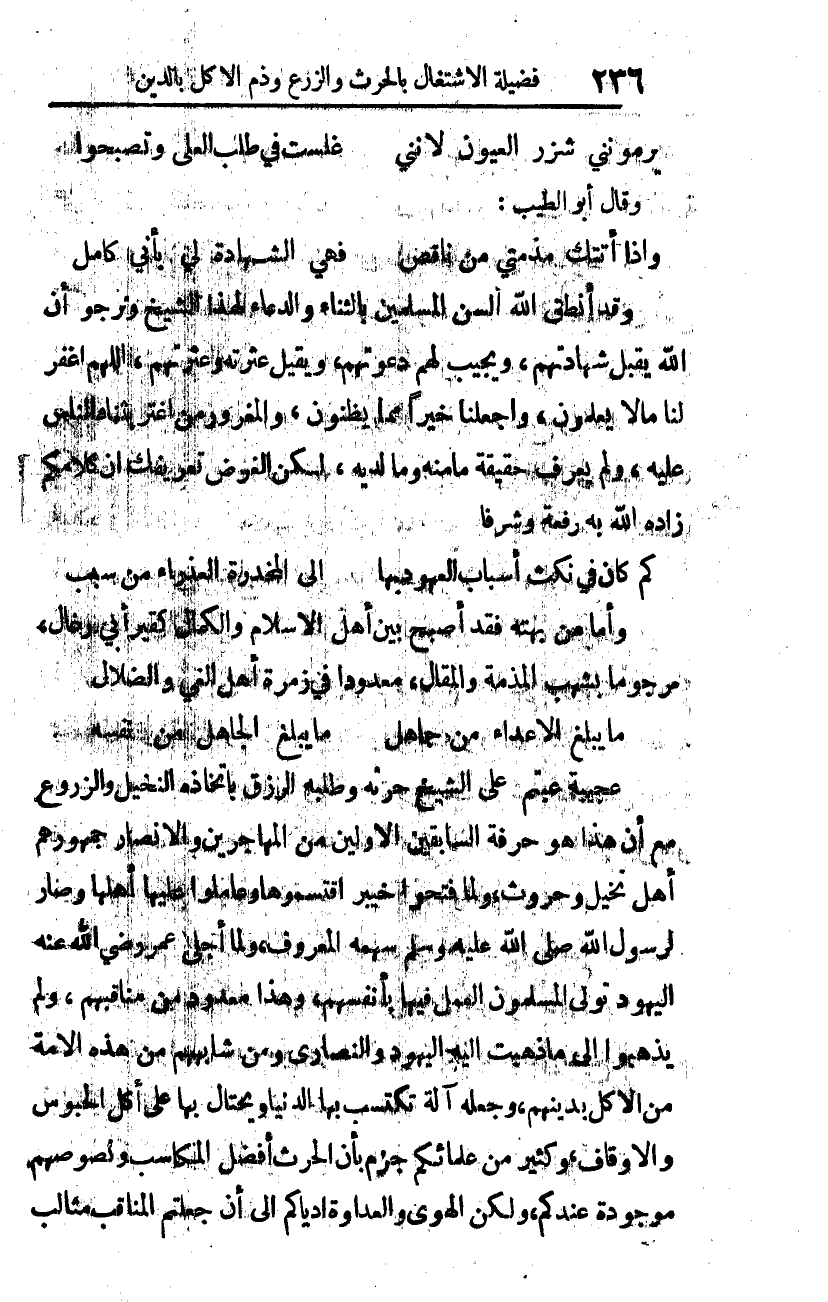 عجيبة عبتم على الشيخ حرثه، وطلبه الرزق باتخاذه النخيل والزروع، مع أن هذا هو حرفة السابقين الأولين من المهاجرين والأنصار، جمهورهم أهل نخيل وحروث، ولما فتحوا خيبر اقتسموها وعاملوا عليها أهلها، وصار لرسول الله صلى الله عليه وسلم سهمه المعروف. ولما أجلى عمر رضي الله عنه اليهود تولى المسلمون العمل فيها بأنفسهم، وهذا معدود من مناقبهم، ولم يذهبوا إلى ما ذهبت إليه اليهود والنصارى، ومن شابههم، من هذه الأمة من الأكل بدينهم، وجعله آلة تكتسب بها الدنيا، ويحتال بها على أكل الحبوس والأوقاف. وكثير من علمائكم جزم بأن الحرث أفضل المكاسب، ونصوصهم موجودة عندكم، ولكن الهوى والعداوة أدياكم إلى أن جعلت المناقب مثالب،