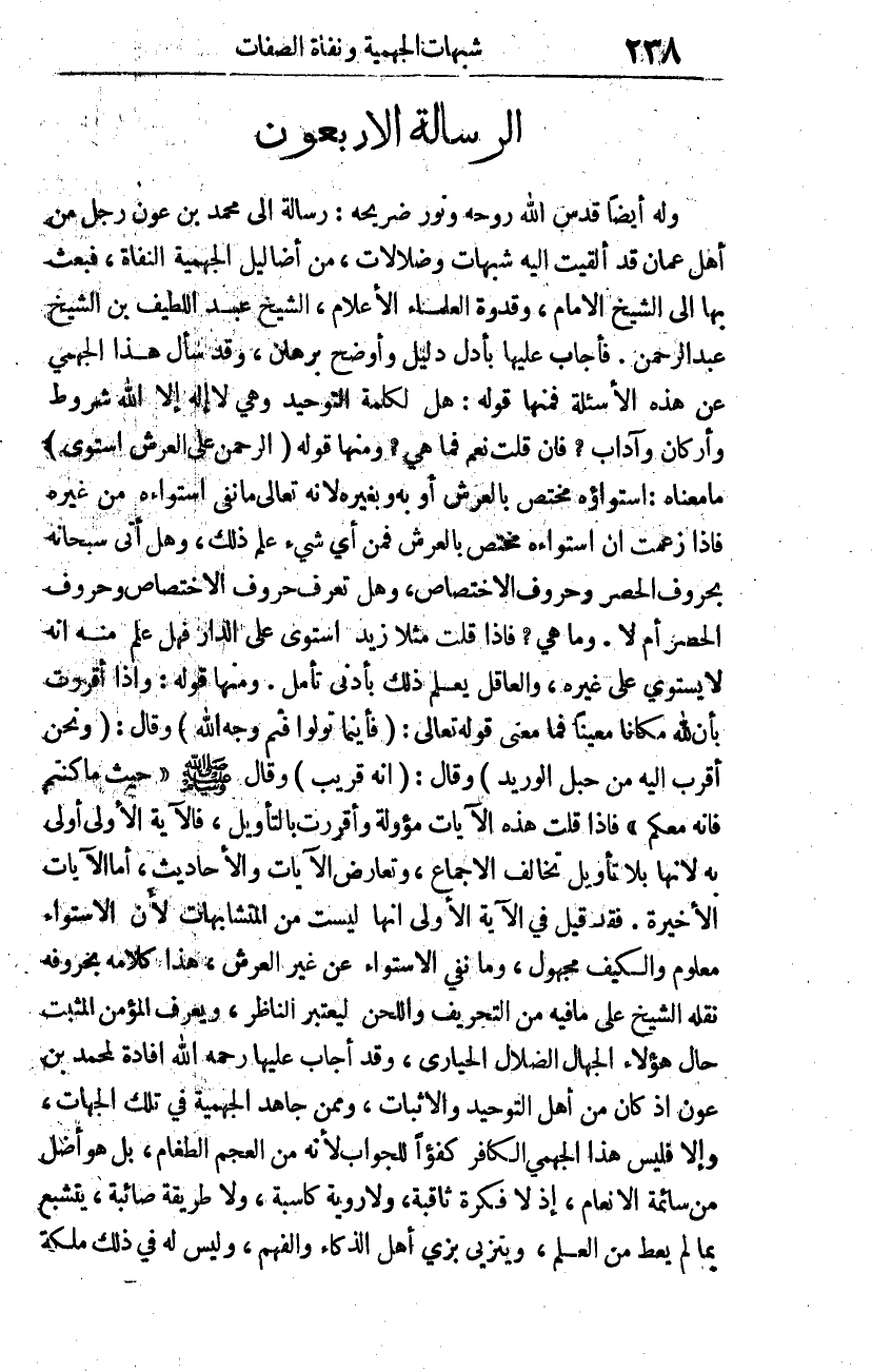 وله أيضا -قدس الله روحه، ونور ضريحه- رسالة إلى محمد بن عون، رجل من أهل عمان، قد ألقيت إليه شبهات وضلالات، من أضاليل الجهمية النفاة، فبعث بها إلى الشيخ الإمام، وقدوة العلماء الأعلام، الشيخ: عبد اللطيف بن الشيخ عبد الرحمن. فأجاب عليها بأدل دليل وأوضح برهان. وقد سأل هذا الجهمي عن هذه الأسئلة، فمنها قوله: هل لكلمة التوحيد -وهي لا إله إلا الله- شروط وأركان وآداب؟ فإن قلت: نعم، فما هي؟. ومنها قوله: {الرَّحْمَنُ عَلَى الْعَرْشِ اسْتَوَى} 1 ما معناه: استواؤه مختص بالعرش أو به وبغيره، لأنه -تعالى- ما نفى استواءه من غيره، فإذا زعمت أن استواءه مختص بالعرش، فمن أي شيء علم ذلك؟ وهل أتى -سبحانه- بحروف الحصر، وحروف الاختصاص؟ وهل تعرف حروف الاختصاص، وحروف الحصر أم لا؟ وما هي؟ فإذا قلت -مثلا-: زيد استوى على الدار. فهل علم منه أنه لا يستوي على غيره؟ والعاقل يعلم ذلك بأدنى تأمل. ومنها قوله: وإذا أقررت بأن لله مكانا معينا، فما معنى قوله -تعالى-: {فَأَيْنَمَا تُوَلُّوا فَثَمَّ وَجْهُ اللَّهِ} 2، وقال: {وَنَحْنُ أَقْرَبُ إِلَيْهِ مِنْ حَبْلِ الْوَرِيدِ} 3، وقال: {إِنَّهُ سَمِيعٌ قَرِيبٌ} 4، وقال صلى الله عليه وسلم "حيث ما كنتم فإنه معكم". فإذا قلت: هذه الآيات مؤولة، وأقررت بالتأويل، فالآية الأولى أولى به لأنها بلا تأويل تخالف الإجماع، وتعارض الآيات والأحاديث. أما الآيات الأخيرة، فقد قيل في الآية الأولى: إنها ليست من المتشابهات لأن الاستواء معلوم، والكيف مجهول، وما نفي الاستواء عن غير العرش، هذا كلامه بحروفه، نقله الشيخ على ما فيه من التحريف واللحن، ليعتبر الناظر، ويعرف المؤمن المثبت حال هؤلاء الجهال الضلال الحيارى. وقد أجاب عليها -رحمه الله- إفادة لمحمد بن عون إذ كان من أهل التوحيد والإثبات، وممن جاهد الجهمية في تلك الجهات، وإلا فليس هذا الجهمي الكافر كفؤا للجواب لأنه من العجم الطغام، بل هو أضل من سائمة الأنعام، إذ لا فكرة ثاقبة، ولا روية كاسبة، ولا طريقة صائبة، يتشبع بما لم يعط من العلم، ويتزيى بزي أهل الذكاء والفهم، وليس له في ذلك ملكة