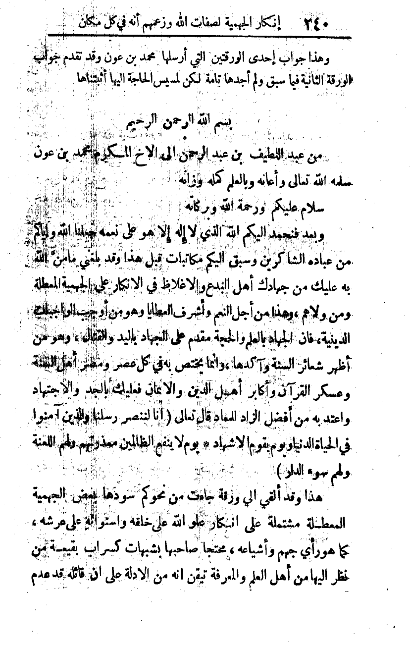 وبعد: فنحمد إليكم الله الذي لا إله إلا هو على نعمه، جعلنا الله وإياكم من عباده الشاكرين. وسبق إليكم مكاتبات قبل هذا، وقد بلغني ما منَّ الله به عليك من جهادك أهل البدع والإغلاظ، في الإنكار على الجهمية المعطلة ومن والاهم، وهذا من أجلّ النعم وأشرف العطايا، وهو من أوجب الواجبات الدينية. فإن الجهاد بالعلم والحجة مقدم على الجهاد باليد والقتال، وهو من أظهر شعائر السنة وآكدها، وإنما يختص به في كل عصر ومصر أهل السنة، وعسكر القرآن، وأكابر أهل الدين والإيمان، فعليك بالجد والاجتهاد، واعتد به من أفضل الزاد للمعاد، قال -تعالى-: {إِنَّا لَنَنْصُرُ رُسُلَنَا وَالَّذِينَ آمَنُوا فِي الْحَيَاةِ الدُّنْيَا وَيَوْمَ يَقُومُ الأَشْهَادُ يَوْمَ لا يَنْفَعُ الظَّالِمِينَ مَعْذِرَتُهُمْ وَلَهُمُ اللَّعْنَةُ وَلَهُمْ سُوءُ الدَّارِ} 1.