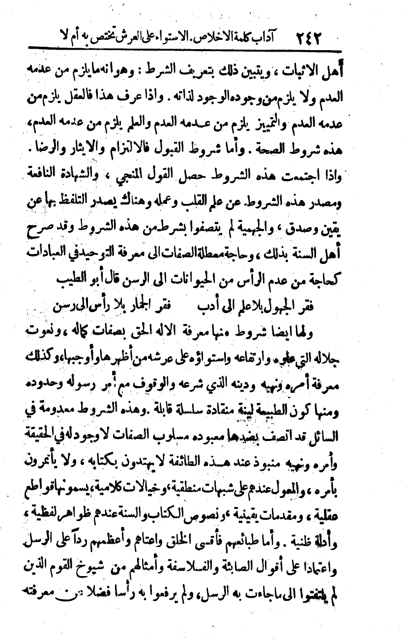 أهل الإثبات، ويتبين ذلك بتعريف الشرط: وهو أنه ما يلزم من عدمه العدم، ولا يلزم من وجوده الوجود لذاته. وإذا عرف هذا، فالعقل يلزم من عدمه العدم، والتمييز يلزم من عدمه العدم، والعلم يلزم من عدمه العدم، هذه شروط الصحة. وأما شروط القبول: فالالتزام والإيثار والرضى. وإذا اجتمعت هذه الشروط حصل القول المنجي، والشهادة النافعة، ومصدر هذه الشروط عن علم القلب وعمله، وهناك يصدر التلفظ بها عن يقين وصدق. والجهمية لم يتصفوا بشرط من هذه الشروط، وقد صرح أهل السنة بذلك، وحاجة معطلة الصفات إلى معرفة التوحيد في العبادات كحاجة من عدم الرأس من الحيوانات إلى الرسن. قال أبو الطيب: