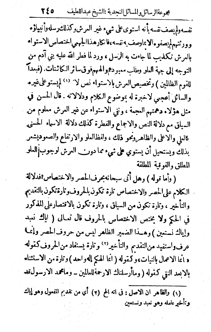 (وأما قوله): وهل أتى -سبحانه- بحرف الحصر والاختصاص؟ فدلالة الكلام على الحصر والاختصاص تارة تكون بالحروف، وتارة تكون بالتقديم والتأخير، وتارة تكون من السياق، وتارة تكون بالاقتصار على المذكور في الحكم، ولا يختص الاختصاص بالحروف قال -تعالى-: {إِيَّاكَ نَعْبُدُ وَإِيَّاكَ نَسْتَعِينُ} 3، وهذا الضمير الظاهر ليس من حروف الحصر، وإنما عرف واستفيد من التقديم والتأخير 4، وتارة يستفاد من الحروف، كقوله: "إنما الأعمال بالنيات"5 وكقوله: {أَنَّمَا إِلَهُكُمْ إِلَهٌ وَاحِدٌ} 6 وتارة من الاستثناء بإلا بعد النفي كقوله: {وَمَا أَرْسَلْنَاكَ إِلَّا رَحْمَةً لِلْعَالَمِينَ} 7، {وَمَا مُحَمَّدٌ إِلَّا رَسُولٌ قَدْ