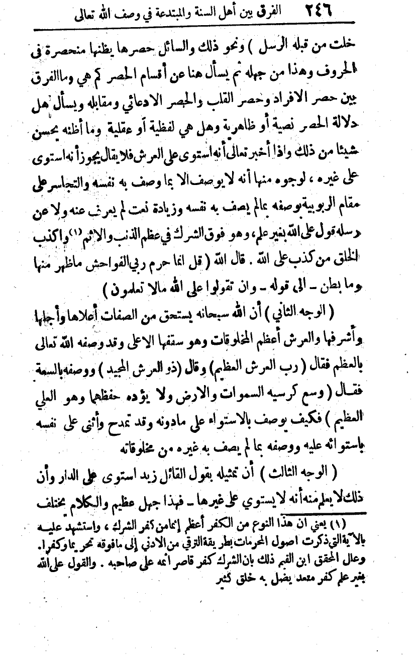 خَلَتْ مِنْ قَبْلِهِ الرُّسُلُ} 1، ونحو ذلك. والسائل حصرها يظنها منحصرة في الحروف، وهذا من جهله، ثم يسأل هنا عن أقسام الحصر، كم هي؟ وما الفرق بين حصر الأفراد وحصر القلب؟ والحصر الادعائي ومقابله، ويسأل هل دلالة الحصر نصية أو ظاهرية؟ وهل هي لفظية أو عقلية؟ وما أظنه يحسن شيئا من ذلك، وإذا أخبر -تعالى- أنه استوى على العرش فلا يقال: يجوز أنه استوى على غيره، لوجوه منها: أنه لا يوصف إلا بما وصف به نفسه، والتجاسر على مقام الربوبية بوصفه بما لم يصف به نفسه وزيادة نعت لم يعرف عنه، ولا عن رسله، قول على الله بغير علم، وهو فوق الشرك في عظم الذنب والإثم 2؛ وأكذب الخلق من كذب على الله. قال الله: {قُلْ إِنَّمَا حَرَّمَ رَبِّيَ الْفَوَاحِشَ مَا ظَهَرَ مِنْهَا وَمَا بَطَنَ} 3 إلى قوله: {وَأَنْ تَقُولُوا عَلَى اللَّهِ مَا لا تَعْلَمُونَ} 4.