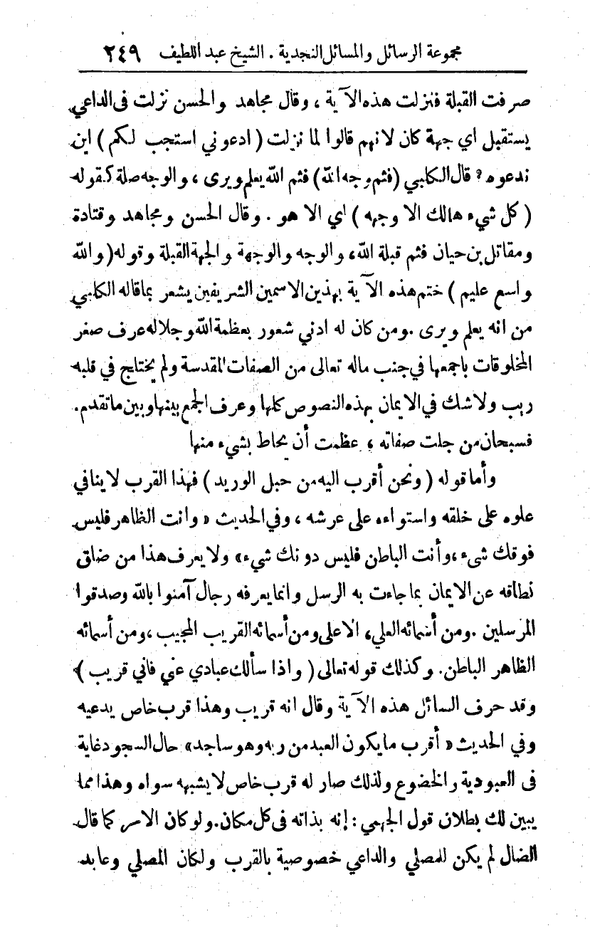 وأما قوله: {وَنَحْنُ أَقْرَبُ إِلَيْهِ مِنْ حَبْلِ الْوَرِيدِ} 5، فهذا القرب لا ينافي علوه على خلقه، واستواءه على عرشه، وفي الحديث: "وأنت الظاهر فليس فوقك شيء، وأنت الباطن فليس دونك شيء"6. ولا يعرف هذا من ضاق نطاقه عن الإيمان بما جاءت به الرسل، وإنما يعرفه رجال آمنوا بالله، وصدقوا المرسلين. ومن أسمائه: العلي الأعلى، ومن أسمائه: القريب المجيب، ومن أسمائه: الظاهر الباطن. وكذلك قوله -تعالى-: {وَإِذَا سَأَلَكَ عِبَادِي عَنِّي فَإِنِّي قَرِيبٌ} 7 وقد حرّف السائل هذه الآية وقال: إنه قريب، وهذا قرب خاص يدعيه، وفي الحديث: "أقرب ما يكون العبد إلى ربه وهو ساجد"8، حال السجود غاية في العبودية والخضوع، ولذلك صار له قرب خاص لا يشبهه سواه، وهذا مما يبين لك بطلان قول الجهمي: "إنه بذاته في كل مكان". ولو كان الأمر كما قال الضال لم يكن للمصلي والداعي خصوصية بالقرب، ولكان المصلي وعابد