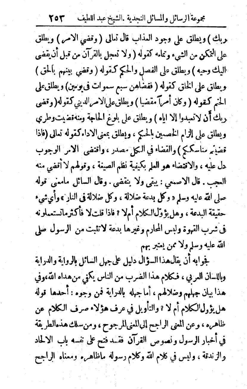 رَبُّكَ} 1. ويطلق على وجود العذاب قال تعالى: {وَقُضِيَ الأَمْرُ} ويطلق على التمكن من الشيء وتمامه كقوله: {وَلا تَعْجَلْ بِالْقُرْآنِ مِنْ قَبْلِ أَنْ يُقْضَى إِلَيْكَ وَحْيُهُ} 2. ويطلق على الفصل والحكم كقوله: {وَقُضِيَ بَيْنَهُمْ بِالْحَقِّ} 3. ويطلق على الخلق كقوله: {فَقَضَاهُنَّ سَبْعَ سَمَاوَاتٍ فِي يَوْمَيْنِ} 4. ويطلق على الحتم كقوله: {وَكَانَ أَمْرًا مَقْضِيًّا} 5. ويطلق على الأمر الديني كقوله: {وَقَضَى رَبُّكَ أَلَّا تَعْبُدُوا إِلَّا إِيَّاهُ} 6. ويطلق على بلوغ الحاجة، ومنه: قضيت وطري، ويطلق على إلزام الخصمين بالحكم. ويطلق بمعنى الأداء كقوله تعالى: {فَإِذَا قَضَيْتُمْ مَنَاسِكَكُمْ} 7. والقضاء في الكل مصدر، واقتضى الأمر الوجوب دل عليه، والاقتضاء هو العلم بكيفية نظم الصيغة، وقولهم: لا أقضي منه العجب. قال الأصمعي: يبقى ولا ينقضي. وقال السائل: ما معنى قوله صلى الله عليه وسلم: "وكل بدعة ضلالة، وكل ضلالة في النار"8، وأي شيء حقيقة البدعة، وهل يؤول الكلام أم لا؟ فإذا قلت: لا فأكثر ما تستعملونه في شرب القهوة ولبس المحارم وغيرها بدعة لا تثبت من الرسول صلى الله عليه وسلم ولا ممن يعتبر بهم.