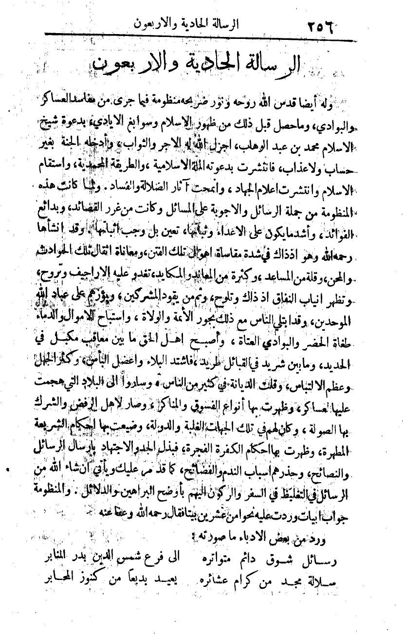 وله أيضا -قدس الله روحه ونور ضريحه- منظومة فيما جرى من مفاسد العساكر والبوادي، وما حصل قبل ذلك من ظهور الإسلام وسوابغ الأيادي، بدعوة شيخ الإسلام محمد بن عبد الوهاب -أجزل الله له الأجر والثواب، وأدخله الجنة بغير حساب ولا عذاب- فانتشرت بدعوته الملة الإسلامية، والطريقة المحمدية، واستقام الإسلام وانتشرت أعلام الجهاد، وانمحت آثار الضلالة والفساد. ولما كانت هذه المنظومة من جملة الرسائل والأجوبة على المسائل، وكانت من غرر القصائد، وبدائع الفوائد، وأشد ما يكون على الأعداء وثباتها، تعين بل وجب إثباتها. وقد أنشأها -رحمه الله- وهو إذ ذاك في شدة مقاساة أهوال تلك الفتن، ومعاناة أثقال تلك الحوادث والمحن، وقلة من المساعد، وكثرة من المعاند والمكايد، تغدو عليه الأراجيف وتروح، وتظهر أنياب النفاق إذ ذاك وتلوح، وثم من يقود المشركين، ويؤزهم على عباد الله الموحدين. وقد ابتلي الناس مع ذلك بجور الأئمة والولاة، واستباح الأموال والدماء طغاة الحضر والبوادي العتاة، وأصبح أهل الحق ما بين معاقب مكبل في الحديد، وما بين شريد في القبائل طريد. فاشتد البلاء وأعضل البأس، وكثر الجهل وعظم الالتباس، وقلت الديانة في كثير من الناس، وساروا إلى البلاد التي هجمت عليها العساكر، وظهرت بها أنواع الفسوق والمناكر. وصار لأهل الرفض والشرك بها الصولة، وكان لهم في تلك الجهات الغلبة والدولة، وضيعت بها أحكام الشريعة المطهرة، وظهرت بها أحكام الكفرة الفجرة، فبذل الجد والاجتهاد بإرسال الرسائل والنصائح، وحذرهم أسباب الندم والفضائح، كما قد مر عليك، ويأتي -إن شاء الله- من الرسائل في التغليظ في السفر والركون إليهم بأوضح البراهين والدلائل. والمنظومة جواب أبيات وردت عليه نحوا من عشرين بيتا فقال -رحمه الله وعفا عنه-: ورد من بعض الأدباء ما صورته:
