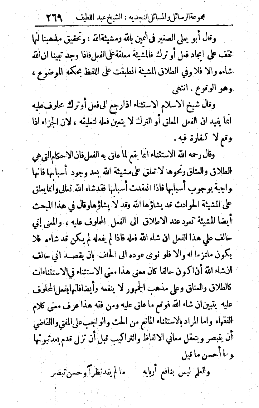 وقال -رحمه الله-*: الاستثناء إنما يقع لما علق به الفعل، فإن الأحكام التي هي الطلاق والعتاق ونحوها لا تعلق على مشيئة الله بعد وجود أسبابها، فإنها واجبة بوجوب أسبابها، فإذا انعقدت أسبابها فقد شاء الله تعالى، وإنما يعلق على المشيئة الحوادث قد يشاؤها الله، وقد لا يشاؤها. وقال في هذا المبحث أيضًا**: المشيئة تعود عند الإطلاق إلى الفعل المحلوف عليه، والمعنى إني حالف على هذا الفعل إن شاء الله فعله. فإذا لم يفعله لم يكن قد شاءه فلا يكون ملتزما له، وإلا فلو نوى عوده إلى الحلف بأن يقصد إني حالف إن شاء الله أن أكون حالفا، كان معنى هذا معنى الاستثناء في الاستثناءات كالطلاق والعتاق، وعلى مذهب الجمهور لا ينفعه. وأيضًا فإنها بفعل المحلوف عليه يتبين إن شاء الله فوقع ما علق عليه، ومن فقه هذا عرف معنى كلام الفقهاء، وأما المراد بالاستثناء المانع من الحث. والواجب على المفتي والقاضي أن يتبصر ويتعقل معاني الألفاظ والتراكيب قبل أن تزل قدم بعد ثبوتها وما أحسن ما قيل:
