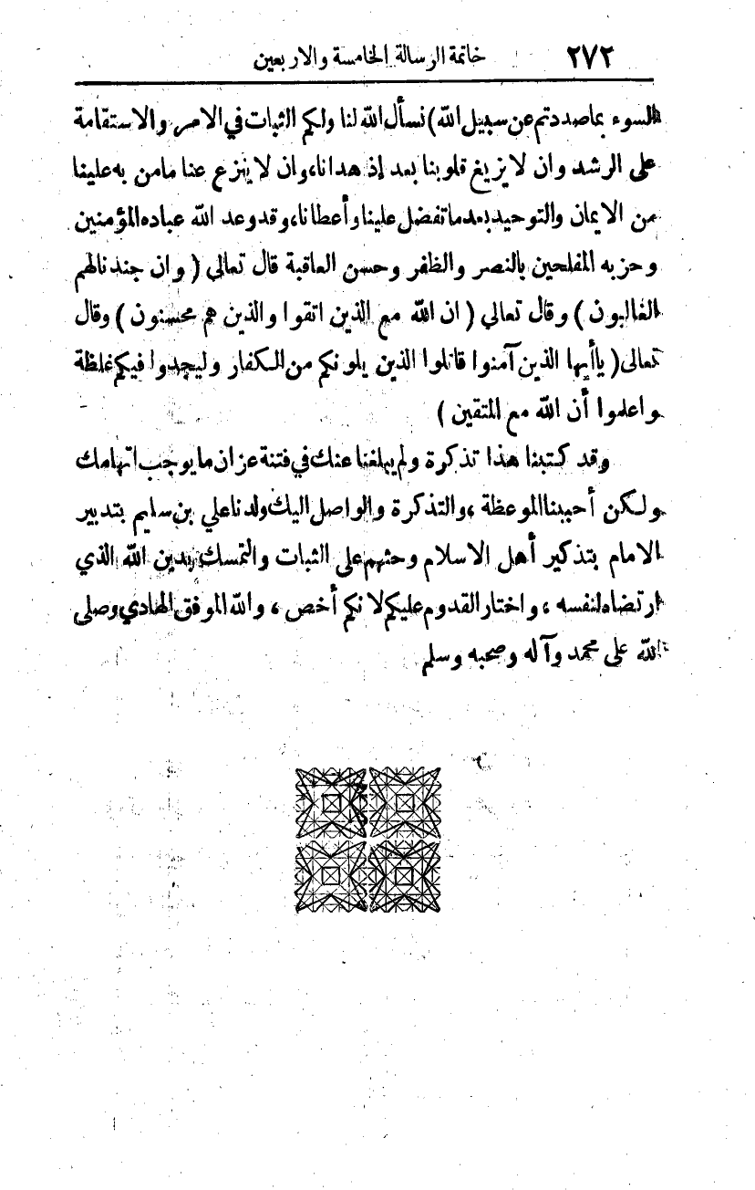 وقد كتبنا هذا تذكرة، ولم يبلغنا عنك في فتنة عزان ما يوجب اتهامك، ولكن أحببنا الموعظة، والتذكرة والواصل إليك ولدنا علي بن سليم بتدبير الإمام بتذكير أهل الإسلام وحثهم على الثبات، والتمسك بدين الله الذي ارتضاه لنفسه، واختار القدوم عليكم لأنكم أخص، والله الموفق الهادي وصلى الله على محمد وآله وصحبه وسلم.