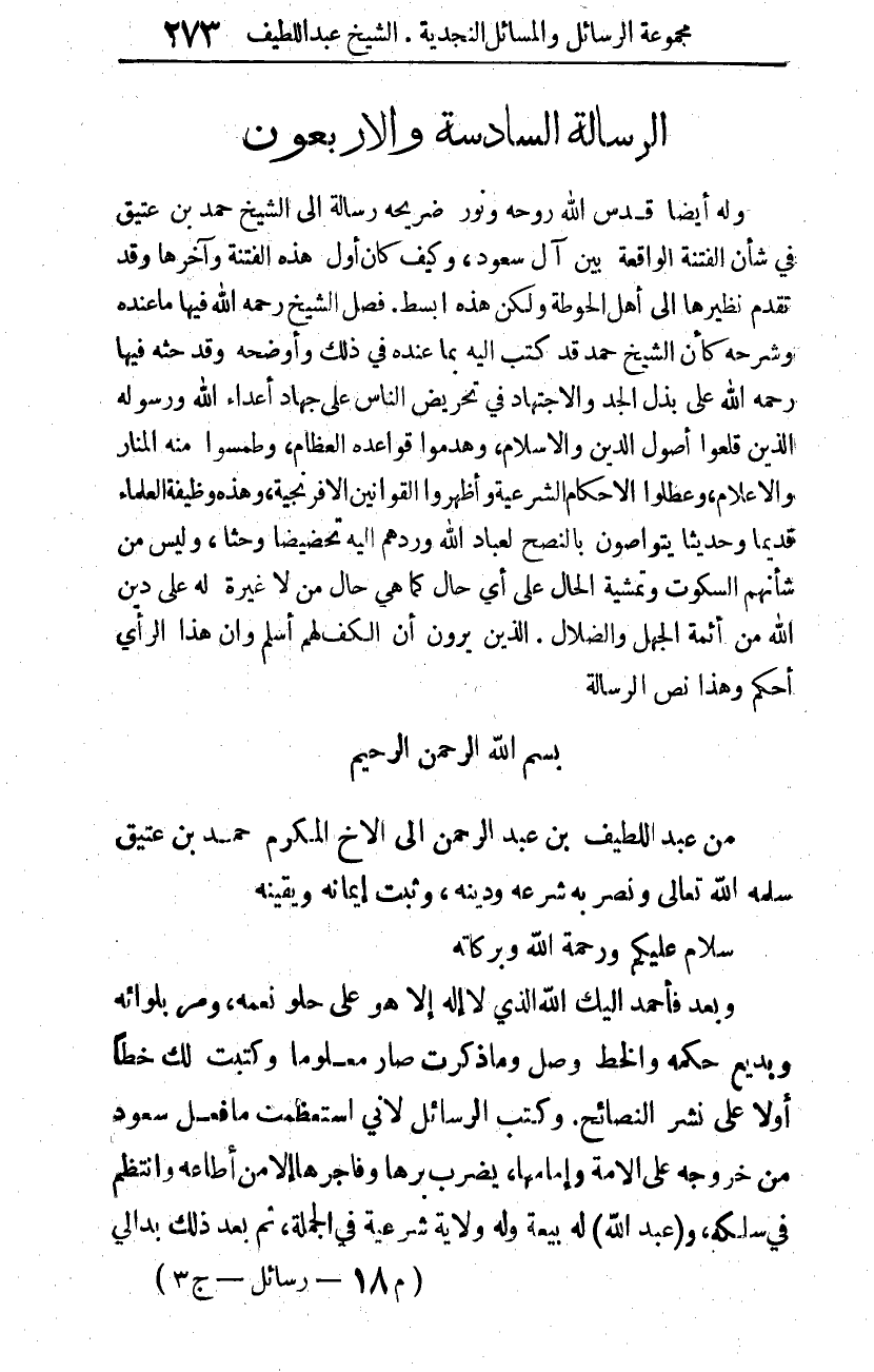 من عبد اللطيف بن عبد الرحمن إلى الأخ المكرم حمد بن عتيق، سلمه الله تعالى ونصر به شرعه ودينه، وثبت إيمانه ويقينه.