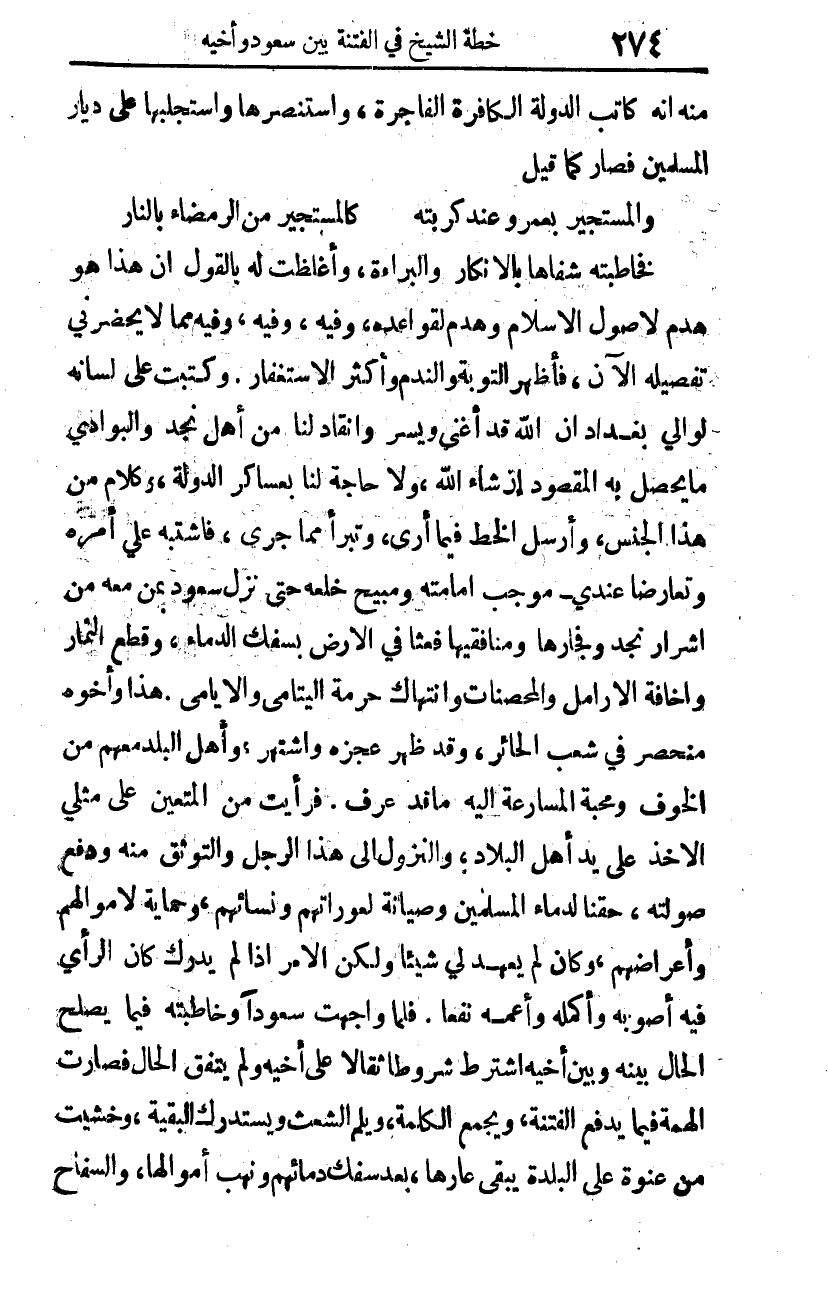 فخاطبته شفاها بالإنكار والبراءة، وأغلظت له بالقول أن هذا هو هدم لأصول الإسلام، وهدم لقواعده، وفيه، وفيه، وفيه مما لا يحضرني تفصيله الآن؛ فأظهر التوبة والندم وأكثر الاستغفار، وكتبت على لسانه لوالي بغداد أن الله قد أغنى ويسر وانقاد لنا من أهل نجد والبوادي ما يحصل به المقصود -إن شاء الله-، ولا حاجة لنا بعساكر الدولة، وكلام من هذا الجنس. وأرسل الخط فيما أرى، وتبرأ مما جرى، فاشتبه علي أمره وتعارضا عندي موجب إمامته ومبيح خلعه، حتى نزل سعود بمن معه من أشرار نجد وفجارها ومنافقيها، فعثا في الأرض بسفك الدماء، وقطع الثمار وإخافة الأرامل والمحصنات، وانتهاك حرمة اليتامى والأيامى. هذا وأخوه منحصر في شعب الحائر، وقد ظهر عجزه واشتهر، وأهل البلد معهم من الخوف ومحبة المسارعة إليه ما قد عرف. فرأيت من المتعين على مثلي الأخذ على يد أهل البلاد، والنّزول إلى هذا الرجل والتوثق منه ودفع صولته، حقنا لدماء المسلمين، وصيانة لعوراتهم ونسائهم، وحماية لأموالهم وأعراضهم. وكان لم يعهد لي شيئا، ولكن الأمر إذا لم يدرك كان الرأي فيه أصوبه وأكمله وأعمه نفعا. فلما واجهت سعودا وخاطبته فيما يصلح الحال بينه وبين أخيه اشترط شروطا ثقالا على أخيه، ولم يتفق الحال، فصارت الهمة فيما يدفع الفتنة، ويجمع الكلمة، ويلم الشعث ويستدرك البقية، وخشيت من عنوة على البلدة يبقى عارها، بعد سفك دمائهم ونهب أموالها، والسفاح