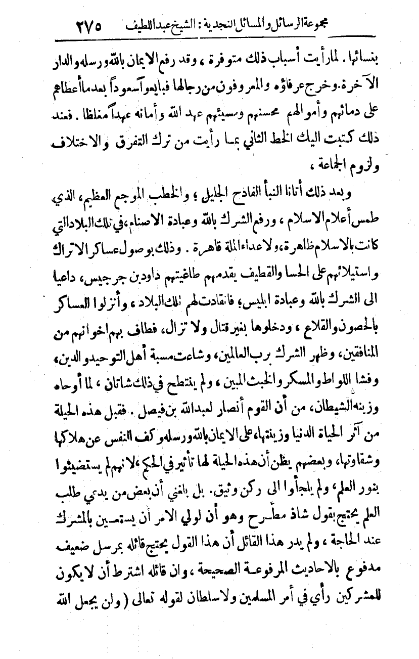 وبعد ذلك أتانا النبأ الفادح الجليل، والخطب الموجع العظيم، الذي طمس أعلام الإسلام، ورفع الشرك بالله وعبادة الأصنام، في تلك البلاد التي كانت بالإسلام ظاهرة، ولأعداء الملة قاهرة، وذلك بوصول عساكر الأتراك واستيلائهم على الحسا والقطيف يقدمهم طاغيتهم داود بن جرجيس، داعيا إلى الشرك بالله وعبادة إبليس؛ فانقادت لهم تلك البلاد، وأنزلوا العساكر بالحصون والقلاع، ودخلوها بغير قتال ولا نزال، فطاف بهم إخوانهم من المنافقين، وظهر الشرك برب العالمين، وشاعت مسبة أهل التوحيد والدين، وفشا اللواط والمسكر والخبث المبين، ولم ينتطح في ذلك شاتان، لما أوحاه وزينه الشيطان، من أن القوم أنصار لعبد الله بن فيصل. فقبل هذه الحيلة من آثر الحياة الدنيا وزينتها، على الإيمان بالله ورسله وكف النفس عن هلاكها وشقاوتها. وبعضهم يظن أن هذه الحيلة لها تأثير في الحكم لأنهم لم يستضيئوا بنور العلم، ولم يلجؤوا إلى ركن وثيق. بل بلغني أن بعض من يدعي طلب العلم يحتج بقول شاذ مطرح، وهو أن لولي الأمر أن يستعين بالمشرك عند الحاجة، ولم يدر هذا القائل أن هذا القول يحتج قائله بمرسل ضعيف مدفوع بالأحاديث المرفوعة الصحيحة، وأن قائله اشترط أن لا يكون للمشركين رأي في أمر المسلمين ولا سلطان، لقوله تعالى: {وَلَنْ يَجْعَلَ اللَّهُ