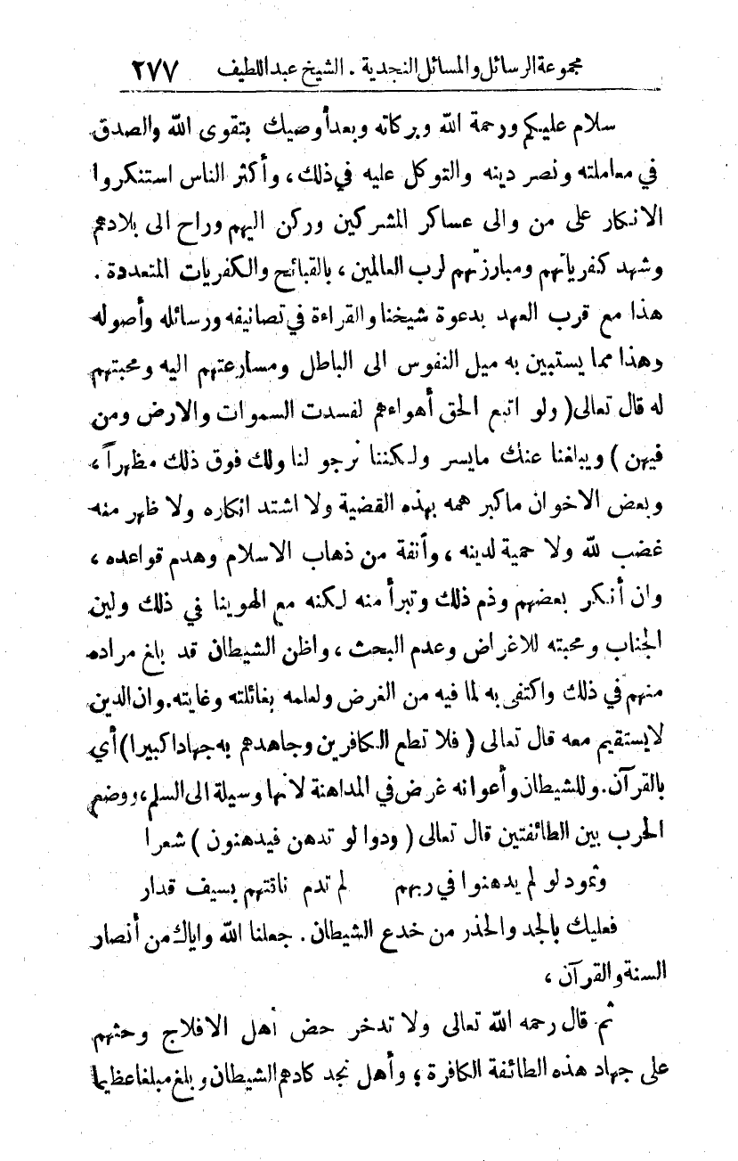 سلام عليكم ورحمة الله وبركاته. وبعد: أوصيك بتقوى الله، والصدق في معاملته، ونصر دينه والتوكل عليه في ذلك، وأكثر الناس استنكروا الإنكار على من والى عساكر المشركين وركن إليهم وراح إلى بلادهم، وشهد كفرياتهم ومبارزتهم لرب العالمين، بالقبائح والكفريات المتعددة. هذا مع قرب العهد بدعوة شيخنا، والقراءة في تصانيفه ورسائله وأصوله، وهذا مما يستبين به ميل النفوس إلى الباطل ومسارعتهم إليه ومحبتهم له، قال تعالى: {وَلَوِ اتَّبَعَ الْحَقُّ أَهْوَاءَهُمْ لَفَسَدَتِ السَّمَاوَاتُ وَالأَرْضُ وَمَنْ فِيهِنَّ} 1، ويبلغنا عنك ما يسر، ولكننا نرجو لنا ولك فوق ذلك مظهرا، وبعض الإخوان ما كبر همه بهذه القضية، ولا اشتد إنكاره ولا ظهر منه غضب لله ولا حمية لدينه، وأنفة من ذهاب الإسلام وهدم قواعده. وإن أنكر بعضهم وذم ذلك، وتبرأ منه لكنه مع الهُوَينا في ذلك ولين الجانب ومحبته للأغراض وعدم البحث. وأظن الشيطان قد بلغ مراده منهم في ذلك، واكتفى به لما فيه من الغرض ولعلمه بغائلته وغايته، وأن الدين لا يستقيم معه قال تعالى: {فَلا تُطِعِ الْكَافِرِينَ وَجَاهِدْهُمْ بِهِ جِهَادًا كَبِيرًا} 2 أي: بالقرآن. وللشيطان وأعوانه غرض في المداهنة لأنها وسيلة إلى السلم، ووضع الحرب بين الطائفتين قال تعالى: {وَدُّوا لَوْ تُدْهِنُ فَيُدْهِنُونَ} 3 شعرا: