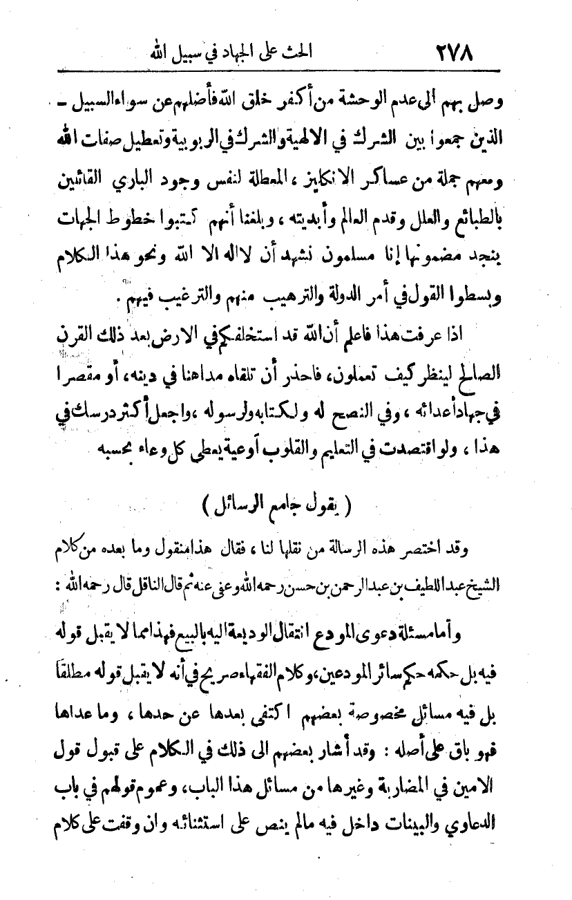 وقد اختصر هذه الرسالة من نقلها لنا، فقال: هذا منقول، وما بعده من كلام الشيخ عبد اللطيف بن عبد الرحمن بن حسن -رحمه الله وعفا عنه-. ثم قال الناقل: قال -رحمه الله-: