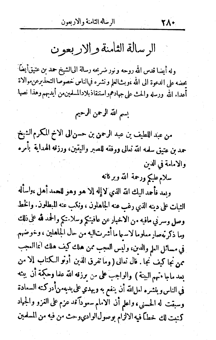 من عبد اللطيف بن عبد الرحمن بن حسن إلى الأخ المكرم الشيخ حمد بن عتيق، سلمه الله تعالى ووفقه للصبر واليقين، ورزقه الهداية بأمره والإمامة في الدين.