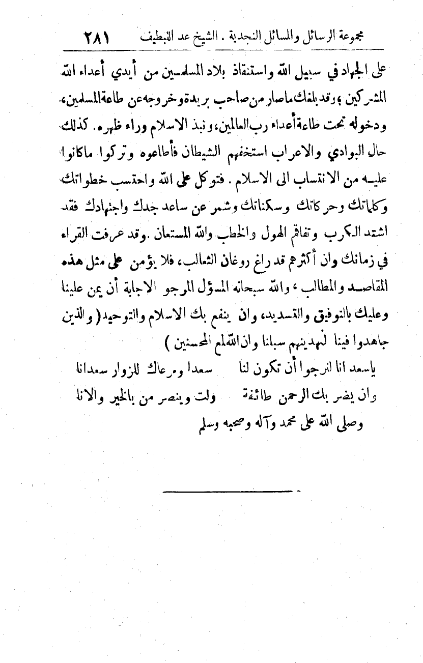 على الجهاد في سبيل الله، واستنقاذ بلاد المسلمين من أيدي أعداء الله المشركين. وقد بلغك ما صار من صاحب بريدة وخروجه عن طاعة المسلمين، ودخوله تحت طاعة أعداء رب العالمين، ونبذ الإسلام وراء ظهره. كذلك حال البوادي والأعراب استخفهم الشيطان، فأطاعوه وتركوا ما كانوا عليه من الانتساب إلى الإسلام. فتوكل على الله واحتسب خطواتك وكلماتك وحركاتك وسكناتك، وشمِّر عن ساعد جدك واجتهادك، فقد اشتد الكرب، وتفاقم الهول والخطب والله المستعان. وقد عرفت القراء في زمانك وأن أكثرهم قد راغ روغان الثعالب، فلا يؤمن على مثل هذه المقاصد والمطالب، والله سبحانه المسؤول المرجو الإجابة أن يمن علينا وعليك بالتوفيق والتسديد، وأن ينفع بك الإسلام والتوحيد: {وَالَّذِينَ جَاهَدُوا فِينَا لَنَهْدِيَنَّهُمْ سُبُلَنَا وَإِنَّ اللَّهَ لَمَعَ الْمُحْسِنِينَ} 1.