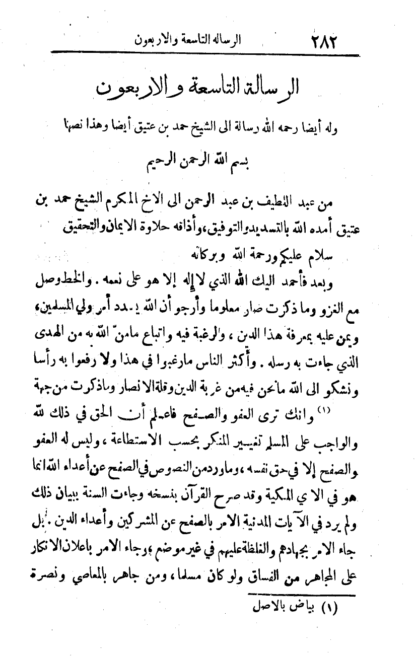 وبعد: فأحمد إليك الله الذي لا إله إلا هو على نعمه. والخط وصل مع الغزو، وما ذكرت صار معلوما، وأرجو أن الله يسدد أمر ولي المسلمين، ويمُنّ عليه بمعرفة هذا الدين، والرغبة فيه، واتباع ما منّ الله به من الهدى الذي جاءت به رسله. وأكثر الناس ما رغبوا في هذا ولا رفعوا به رأسا، ونشكو إلى الله ما نحن فيه من غربة الدين وقلة الأنصار وما ذكرت من جهة ... 1 وأنك ترى العفو والصفح، فاعلم أن الحق في ذلك لله، والواجب على المسلم تغيير المنكر بحسب الاستطاعة، وليس له العفو والصفح إلا في حق نفسه؛ وما ورد من النصوص في الصفح عن أعداء الله إنما هو في الآي المكية، وقد صرح القرآن بنسخه وجاءت السنة ببيان ذلك، ولم يرد في الآيات المدنية الأمر بالصفح عن المشركين وأعداء الدين، بل جاء الأمر بجهادهم والغلظة عليهم في غير موضع، وجاء الأمر بإعلان الإنكار على المجاهر من الفساق ولو كان مسلما، ومن جاهر بالمعاصي ونصرة