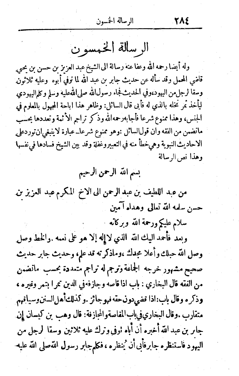 وله أيضا -رحمه الله وعفا عنه- رسالة إلى الشيخ عبد العزيز بن حسن بن يحيى قاضي المحمل، وقد سأله عن حديث جابر بن عبد الله لما توفي أبوه، وعليه ثلاثون وسقا لرجل من اليهود، وفي الحديث: "فجاء رسول الله صلى الله عليه وسلم وكلم اليهودي ليأخذ ثمر نخله بالذي له فأبى"1. قال السائل: وظاهر هذا إباحة المجهول بالمعلوم في الجنس، وهذا ممنوع شرعا فأجابه -رحمه الله-، وذكر تراجم الأئمة، وتعددها بحسب ما تضمن من الفقه، وأن قول السائل: وهو ممنوع شرعا - عبارة لا ينبغي أن تورد على الأحاديث النبوية، وهي خطأ منه في التعبير وغفلة، وقد بين الشيخ فسادها في نفسها، وهذا نص الرسالة: