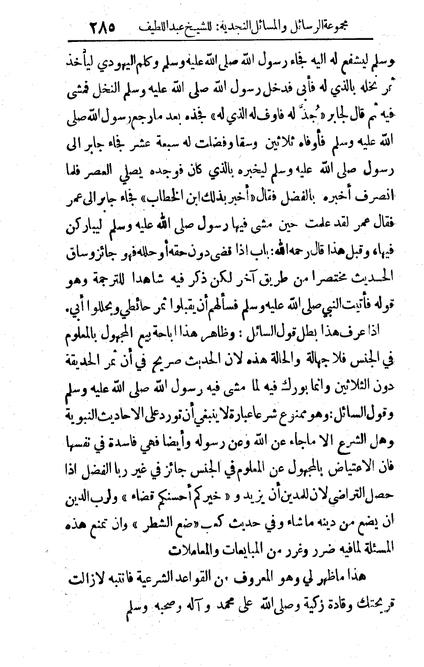 وسلم ليشفع له إليه، فجاء رسول الله صلى الله عليه وسلم وكلم اليهودي ليأخذ ثمر نخله بالذي له، فأبى، فدخل رسول الله صلى الله عليه وسلم النخل فمشى فيه، ثم قال لجابر: "جُذَّ له فأوف له الذي له"1، فجذه بعدما رجع رسول الله صلى الله عليه وسلم فأوفاه ثلاثين وَسْقا، وفضلت له سبعة عشر، فجاء جابر إلى رسول الله صلى الله عليه وسلم ليخبره بالذي كان فوجده يصلي العصر فلما انصرف أخبره بالفضل فقال: "أخبر بذلك ابن الخطاب"2. فجاء جابر إلى عمر فقال عمر: لقد علمت حين مشى فيها رسول الله -صلى الله عليه وسلم- َليبارَكنّ فيها، وقبل هذا قال -رحمه الله-: باب: إذا قضى دون حقه أو حلله فهو جائز، وساق الحديث مختصرا من طريق آخر، لكن ذكر فيه شاهدا للترجمة، وهو قوله: فأتيت النبي صلى الله عليه وسلم فسألهم أن يقبلوا ثمر حائطي ويحللوا أبي. إذا عُرِف هذا بطل قول السائل: وظاهر هذا إباحة بيع المجهول بالمعلوم في الجنس، فلا جهالة والحالة هذه لأن الحديث صريح في أن ثمر الحديقة دون الثلاثين، وإنما بُورِك فيه لما مشى فيه رسول الله صلى الله عليه وسلم. وقول السائل: وهو ممنوع شرعا، عبارة لا ينبغي أن تورد على الأحاديث النبوية، وهل الشرع إلا ما جاء عن الله وعن رسوله؟ وأيضا فهي فاسدة في نفسها، فإن الاعتياض بالمجهول عن المعلوم في الجنس جائز في غير رِبا الفضل إذا حصل التراضي، لأن للمدِين أن يزيد، و"خيركم أحسنكم قضاء" ولرب الدَّين أن يضع من دينه ما شاء، وفي حديث كعب: "ضع الشطر"3 وأن تمنع هذه المسألة لما فيه ضرر وغرر من المبايعات والمعاملات.