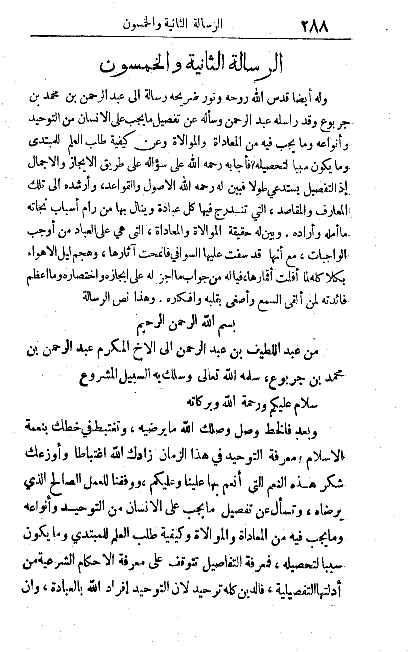 وله أيضا -قدس الله روحه ونور ضريحه- رسالة إلى عبد الرحمن بن محمد بن جربوع، وقد راسله عبد الرحمن، وسأله عن تفصيل ما يجب على الإنسان من التوحيد وأنواعه، وما يجب فيه من المعاداة والموالاة، وعن كيفية طلب العلم للمبتدي وما يكون سببا لتحصيله؟ فأجابه -رحمه الله- على سؤاله على طريق الإيجاز والإجمال؛ إذ التفصيل يستدعي طولا؛ فبين له -رحمه الله- الأصول والقواعد، وأرشده إلى تلك المعارف والمقاصد، التي تندرج فيها كل عبادة، وينال بها من رام أسباب نجاته ما أمّله وأراده، وبين له حقيقة الموالاة والمعاداة، التي هي على العباد من أوجب الواجبات، مع أنها قد سفت عليها السوافي فانمحت آثارها، وهجم ليل الأهواء بكلاكله لما أفَلت أقمارها، فيا له من جواب ما أجزله على إيجازه واختصاره! وما أعظم فائدته لمن ألقى السمع وأصغى بقلبه وأفكاره! وهذا نص الرسالة: