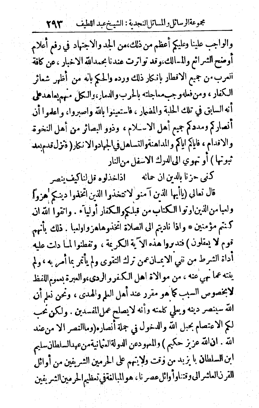 والواجب علينا وعليكم أعظم من ذلك، من الجد والاجتهاد في رفع أعلام أوضح الشرائع والمسالك. وقد تواترت عندنا بحمد الله الأخبار، عن كافة العرب من جميع الأقطار بإنكار ذلك وردّه، والحكم بأنه من أظهر شعائر الكفار، ومن فعله وجب معالجته بالحرب والدمار، والكل منهم يعاهد على أنه السابق في تلك الحلبة والمضمار. فاستعينوا بالله واصبروا، واعلموا أن أنصاركم ومددكم جميع أهل الإسلام، وذوو البصائر من أهل النخوة والإقدام. فإياكم إياكم والمداهنة والتساهل في الجهاد والإنكار، فتزل قدم بعد ثبوتها، أو تهوي إلى الدرك الأسفل من النار.