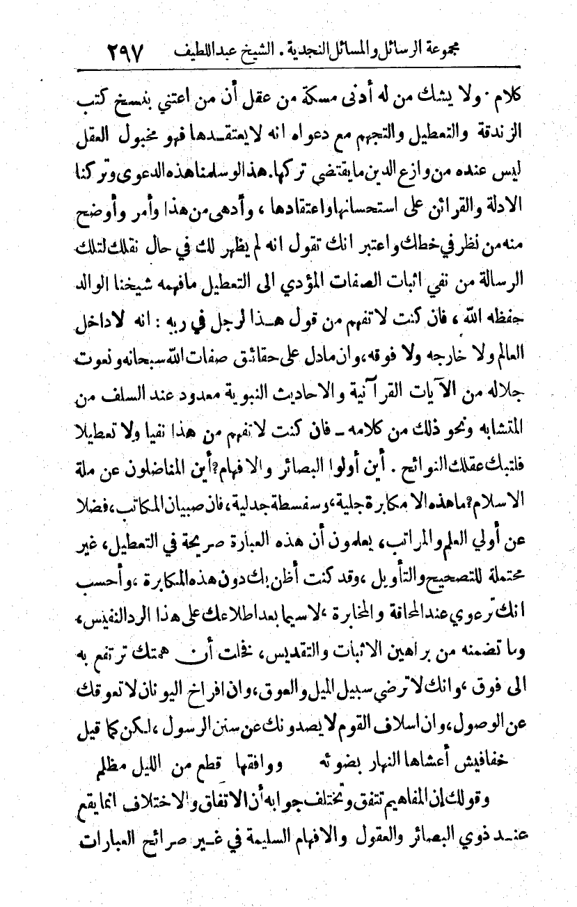 كلام. ولا يشك من له أدنى مسكة من عقل أن من اعتنى بنسخ كتب الزندقة والتعطيل والتجهم مع دعواه أنه لا يعتقدها، فهو مخبول العقل ليس عنده من وازع الدين ما يقتضي تركها. هذا لو سلمنا هذه الدعوى وتركنا الأدلة والقرائن على استحسانها واعتقادها، وأدهى من هذا وأمر وأوضح منه من نظر في خطك واعتبر أنك تقول: إنه لم يظهر لك في حال نقلك لتلك الرسالة من نفي إثبات الصفات المؤدي إلى التعطيل ما فهمه شيخنا الوالد -حفظه الله-، فإن كنت لا تفهم من قول هذا الرجل في ربه: إنه لا داخلَ العالم ولا خارجه ولا فوقه، وإن ما دل على حقائق صفات الله سبحانه، ونعوت جلاله من الآيات القرآنية والأحاديث النبوية معدود عند السلف من المتشابه، ونحو ذلك من كلامه، فإن كنت لا تفهم من هذا نفيا ولا تعطيلا فلتبك عقلك النوائح. أين أولو البصائر والأفهام؟! أين المناضلون عن ملة الإسلام؟! ما هذه إلا مكابرة جلية، وسفسطة جدلية، فإن صبيان المكاتب، فضلا عن أولي العلم والمراتب، يعلمون أن هذه العبارة صريحة في التعطيل، غير محتملة للتصحيح والتأويل، وقد كنت أظن بك دون هذه المكابرة، وأحسب أنك ترعوي عند المحاقّة والمخابرة، لا سيما بعد اطلاعك على هذا الرد النفيس، وما تضمنه من براهين الإثبات والتقديس، فخلت أن همتك ترتفع به إلى فوق، وأنك لا ترضى سبيل الميل والعوق، وأن أفراخ اليونان لا تعوقك عن الوصول، وأن أسلاف القوم لا يصدونك عن سنن الرسول، لكن كما قيل: