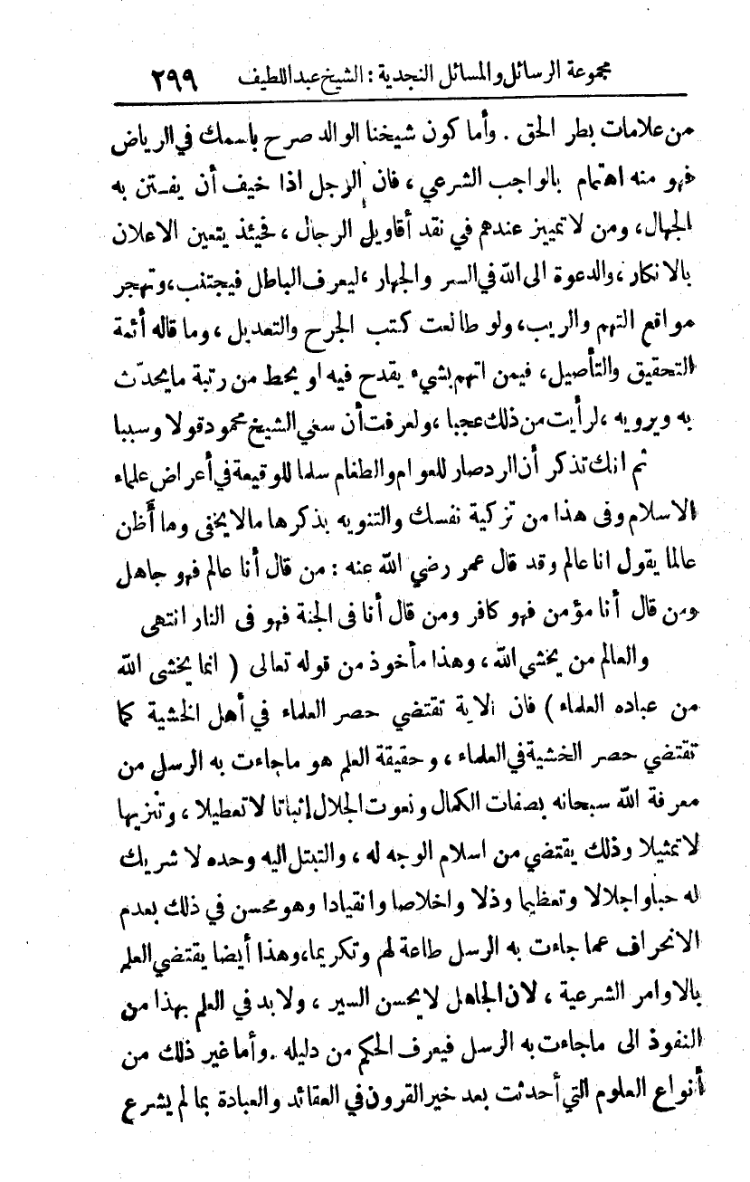 والعالم من يخشى الله، وهذا مأخوذ من قوله تعالى: {إِنَّمَا يَخْشَى اللَّهَ مِنْ عِبَادِهِ الْعُلَمَاءُ} 1 فإن الآية تقتضي حصر العلماء في أهل الخشية كما تقتضي حصر الخشية في العلماء، وحقيقة العلم هو ما جاءت به الرسل من معرفة الله سبحانه بصفات الكمال، ونعوت الجلال إثباتا لا تعطيلا، وتنْزيها لا تمثيلا، وذلك يقتضي من إسلام الوجه له، والتبتل إليه وحده لا شريك له حبا وإجلالا وتعظيما وذلا وإخلاصا وانقيادا، وهو محسن في ذلك بعدم الانحراف عما جاءت به الرسل طاعة لهم وتكريما. وهذا أيضا يقتضي العلم بالأوامر الشرعية لأن الجاهل لا يحسن السير، ولا بد في العلم بهذا من النفوذ إلى ما جاءت به الرسل، فيعرف الحكم من دليله. وأما غير ذلك من أنواع العلوم التي أُحدثت بعد خير القرون في العقائد والعبادة بما لم يشرع
