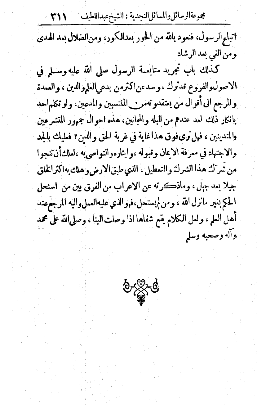 كذلك باب تجريد متابعة الرسول صلى الله عليه وسلم في الأصول والفروع قد ترك، وسد عن أكثر من يدعي العلم والدين، والعمدة والمرجع إلى أقوال من يعتقدونه من المنتسبين والمدعين، ولو تكلم أحد بإنكار ذلك لعد عندهم من البله والمجانين. هذه أحوال جمهور المتشرعين والمتدينين، فهل ترى فوق هذا غاية في غربة الحق والدين؟ فعليك بالجد والاجتهاد في معرفة الإيمان وقبوله، وإيثاره والتواصي به، لعلك أن تنجو من شرك هذا الشرك والتعطيل، الذي طبق الأرض، وهلك به أكثر الخلق جيلا بعد جيل. وما ذكرته عن الأعراب من الفرق بين من استحل الحكم بغير ما نزل الله، ومن لم يستحل، فهو الذي عليه العمل وإليه المرجع عند أهل العلم، ولعل الكلام يقع شفاها إذا وصلت إلينا، وصلى الله على محمد وآله وصحبه وسلم.