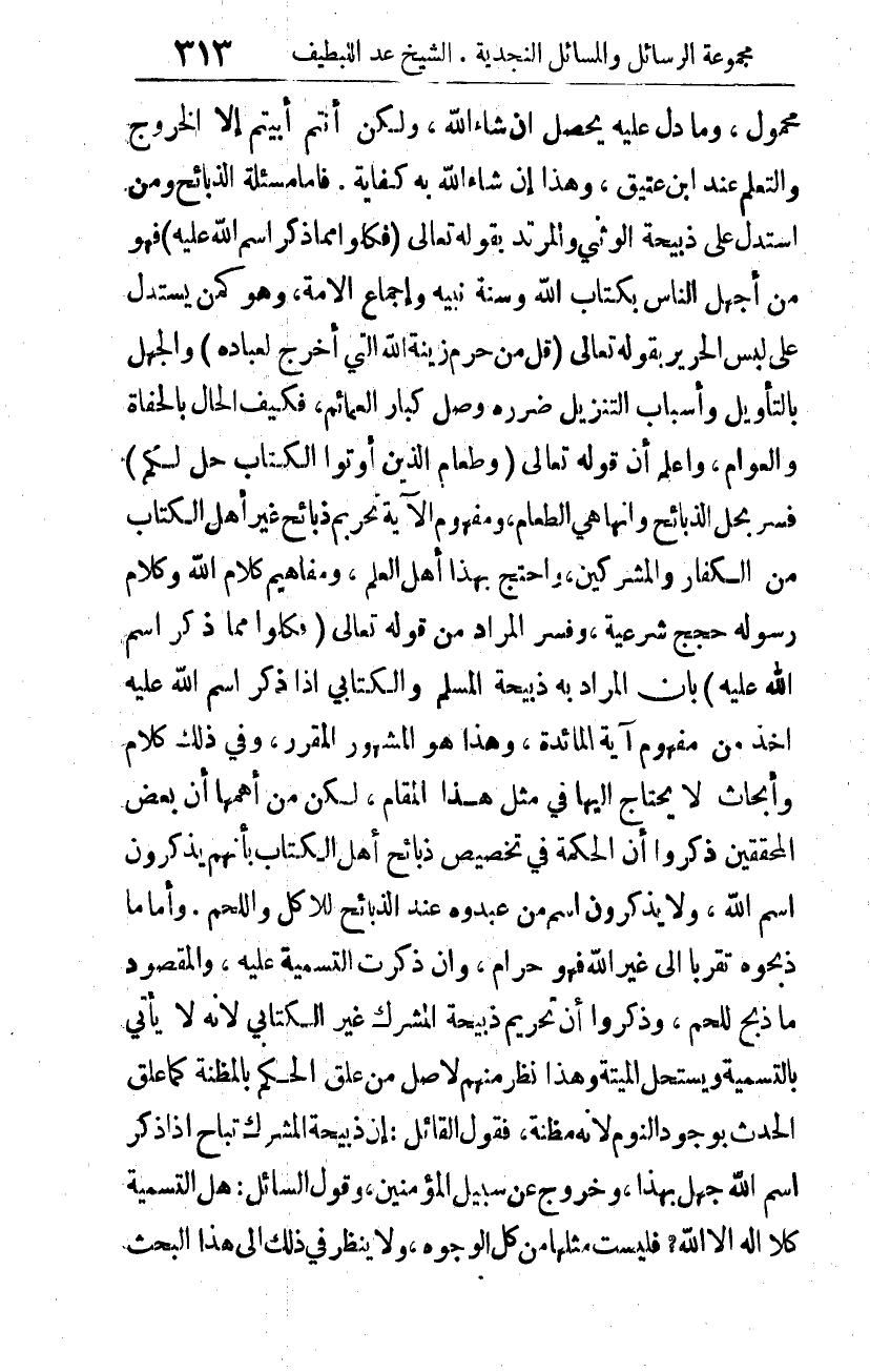 فأما مسألة الذبائح، ومن استدل على ذبيحة الوثني والمرتد بقوله -تعالى-: {فَكُلُوا مِمَّا ذُكِرَ اسْمُ اللَّهِ عَلَيْهِ} 1، فهو من أجهل الناس بكتاب الله وسنه نبيه وإجماع الأمة، وهو كمن يستدل على لبس الحرير بقوله -تعالى-: {قُلْ مَنْ حَرَّمَ زِينَةَ اللَّهِ الَّتِي أَخْرَجَ لِعِبَادِهِ} 2 والجهل بالتأويل، وأسباب التنْزيل ضرره وصل كبائر العمائم، فكيف الحال بالحفاة والعوام. واعلم أن قوله -تعالى-: {وَطَعَامُ الَّذِينَ أُوتُوا الْكِتَابَ حِلٌّ لَكُمْ} 3 فسر بحل الذبائح وأنها هي الطعام، ومفهوم الآية: تحريم ذبائح غير أهل الكتاب من الكفار والمشركين؛ واحتج بهذا أهل العلم، ومفاهيم كلام الله، وكلام رسوله حجج شرعية، وفسر المراد من قوله تعالى: {فَكُلُوا مِمَّا ذُكِرَ اسْمُ اللَّهِ عَلَيْهِ} 4 بأن المراد به ذبيحة المسلم والكتابي إذا ذكر اسم الله عليه أخذ من مفهوم آية المائدة، وهذا هو المشهور المقرر. وفي ذلك كلام وأبحاث لا يحتاج إليها في مثل هذا المقام، لكن من أهمها أن بعض المحققين ذكروا أن الحكمة في تخصيص ذبائح أهل الكتاب بأنهم يذكرون اسم الله، ولا يذكرون اسم من عبدوه عند الذبائح للأكل واللحم، وأما ما ذبحوه تقربا إلى غير الله فهو حرام، وإن ذكرت التسمية عليه، والمقصود ما ذبح للحم. وذكروا أن تحريم ذبيحة المشرك غير الكتابي؛ لأنه لا يأتي بالتسمية ويستحل الميتة، وهذا نظر منهم لأصل من علق الحكم بالمظنة كما علق الحدث بوجود النوم لأنه مظنة. فقول القائل: إن ذبيحة المشرك تباح إذا ذكر اسم الله جهل بهذا، وخروج عن سبيل المؤمنين، وقول السائل: هل التسمية كلا إله إلا الله؟ فليست مثلها من كل الوجوه، ولا ينظر في ذلك إلى هذا البحث.