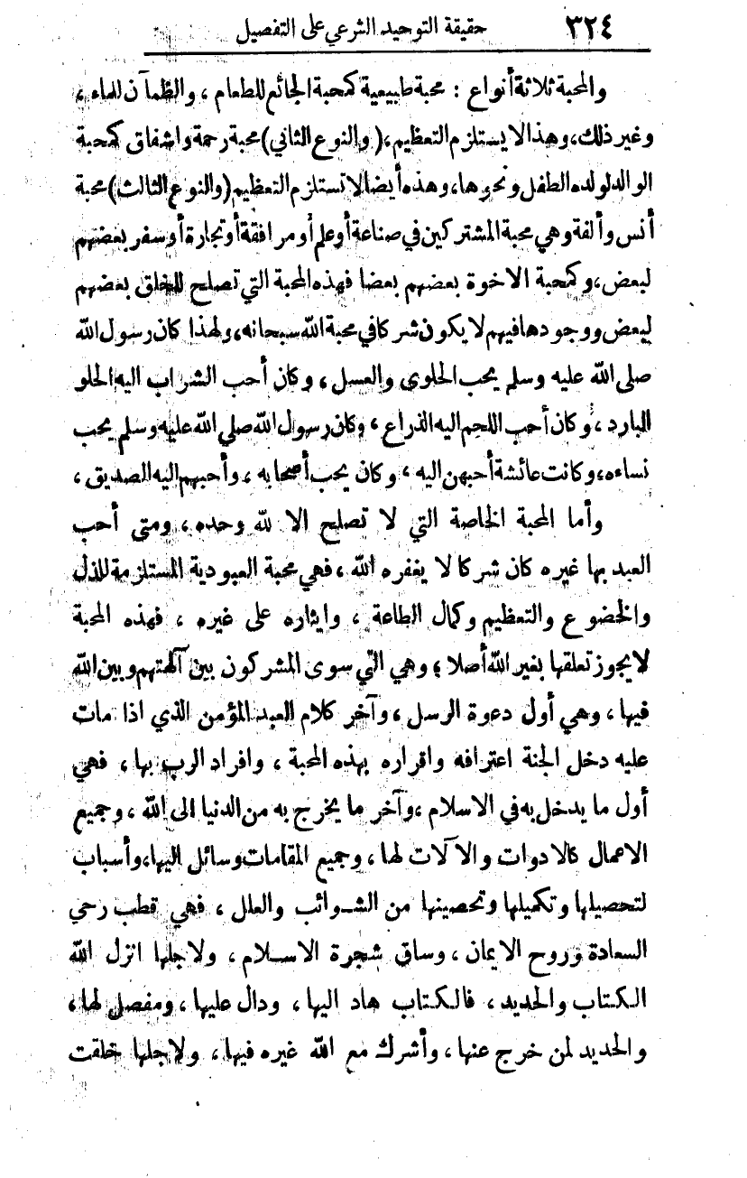 والمحبة ثلاثة أنواع: محبة طبيعية كمحبة الجائع للطعام، والظمآن للماء، وغير ذلك، وهذا لا يستلزم التعظيم. (والنوع الثاني): محبة رحمة وإشفاق كمحبة الوالد لولده الطفل ونحوها؛ وهذه أيضا لا تستلزم التعظيم. (والنوع الثالث): محبة أنس وألفة؛ وهي محبة المشتركين في صناعة أو علم، أو مرافقة، أو تجارة، أو سفر بعضهم لبعض، وكمحبة الأخوة بعضهم بعضا، فهذه المحبة التي تصلح للخلق بعضهم لبعض ووجودها فيهم لا يكون شركا في محبة الله -سبحانه-، ولهذا كان رسول الله صلى الله عليه وسلم يحب الحلوى والعسل، وكان أحب الشراب إليه الحلو البارد، وكان أحب اللحم إليه الذراع، وكان رسول الله صلى الله عليه وسلم يحب نساءه، وكانت عائشة أحبهن إليه، وكان يحب أصحابه، وأحبهم إليه الصديق.